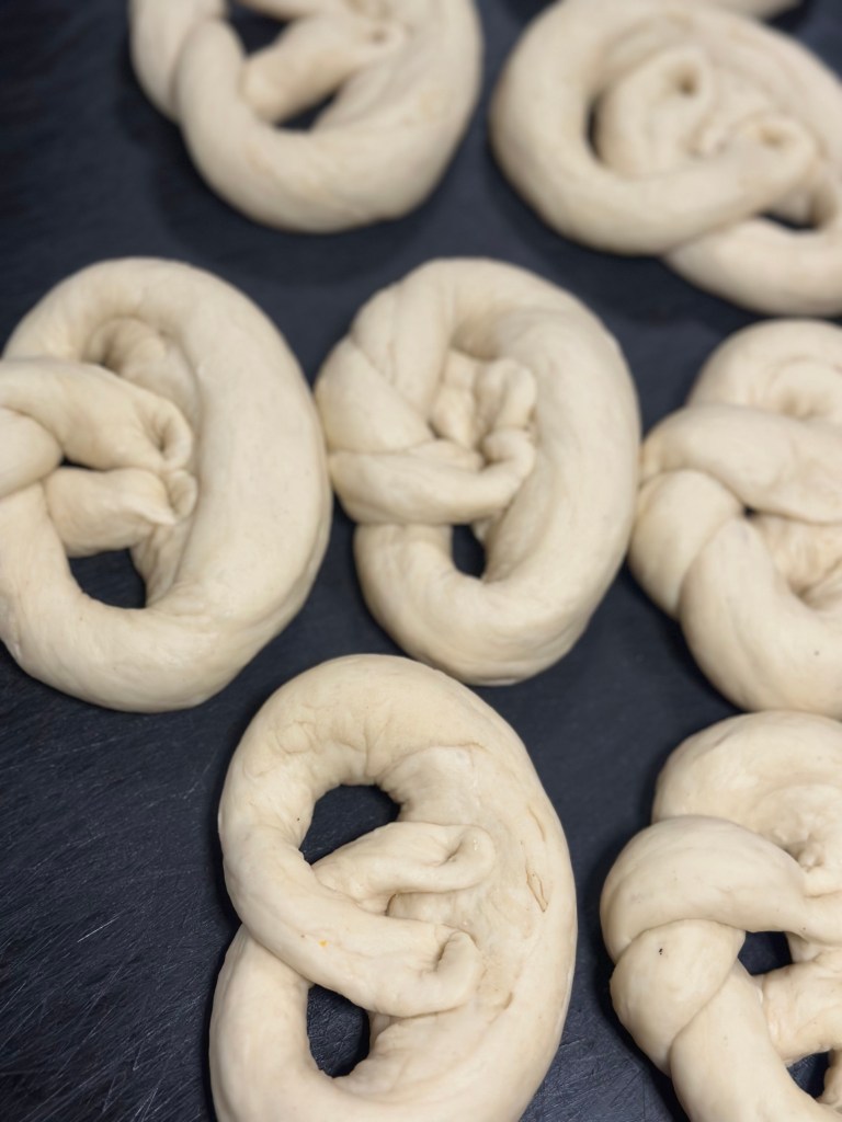 - Form en klassisk pretzel-knude (slå en løkke og kryds enderne henover).