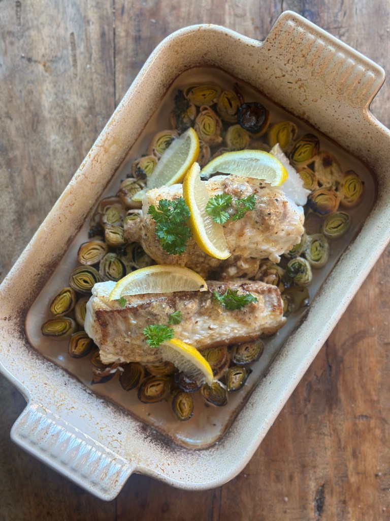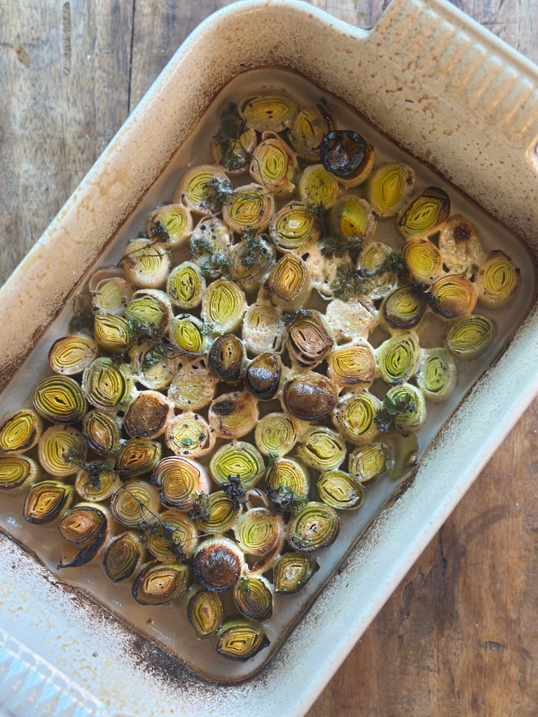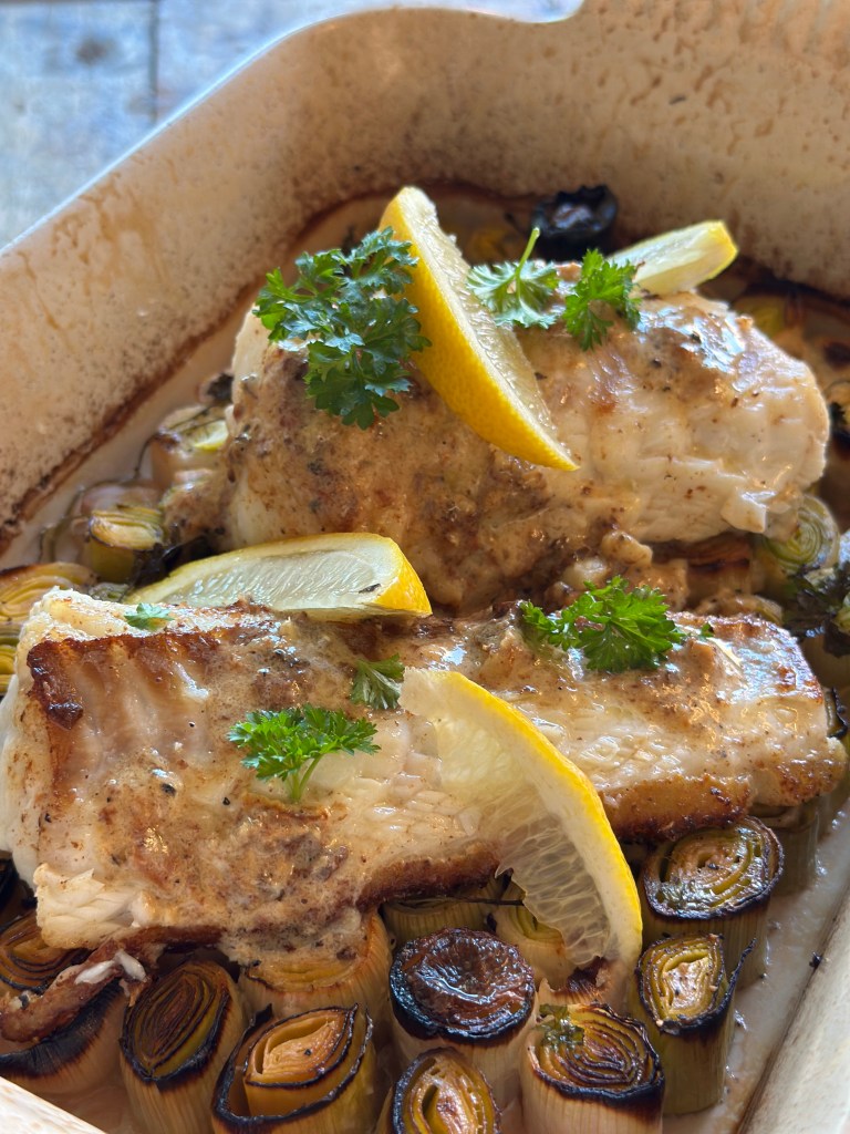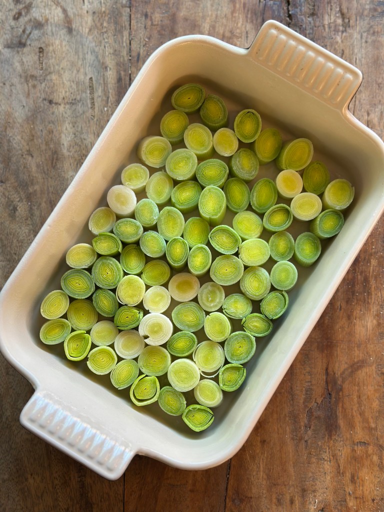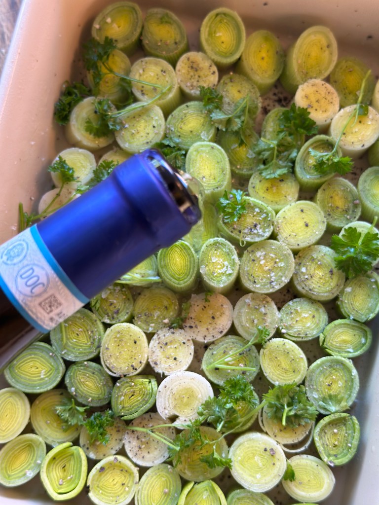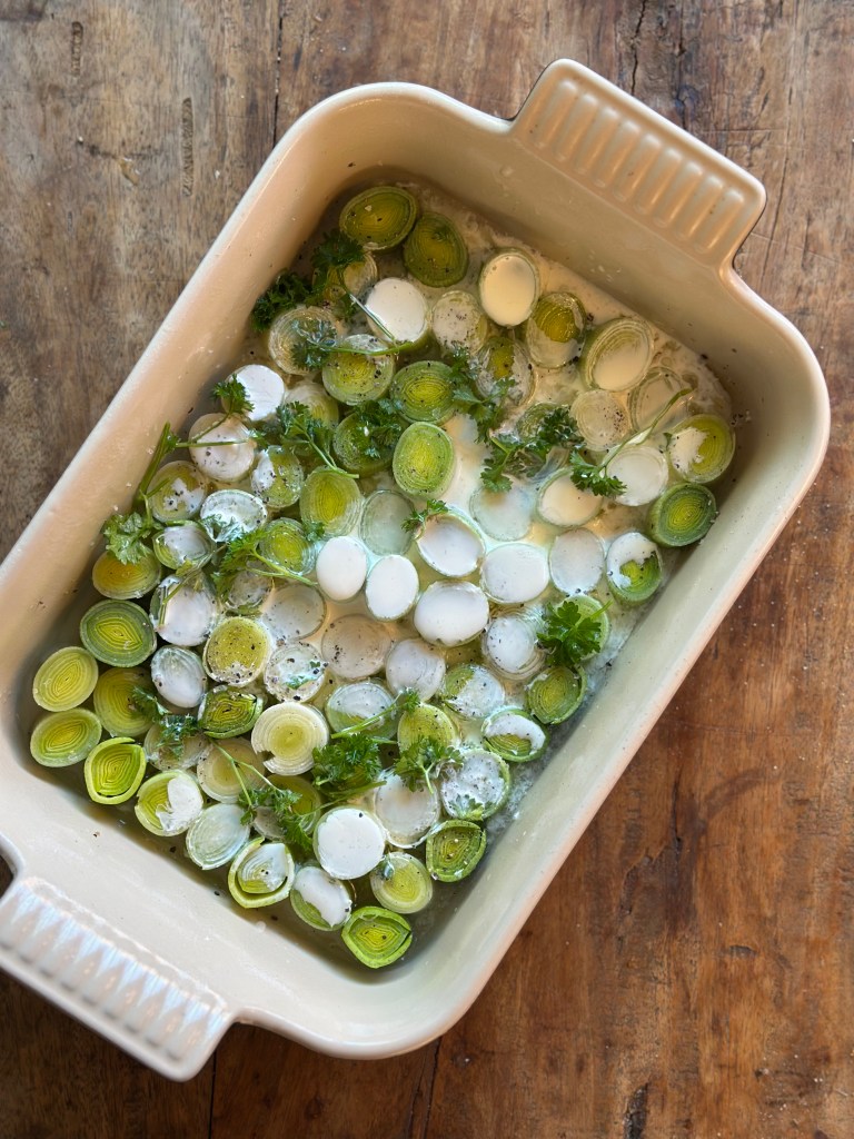 Jeg sprayer smør i et ovnfast fad, og skær porerne i 3 cm stykker. Herefter monterer jeg dem i fadet, så de fylder det hele. Kommer hvidvin, fløde, persille, salt og peber i. I ovnen i ca. 25 minutter ved 180 grader – de må godt blive lidt mørke,