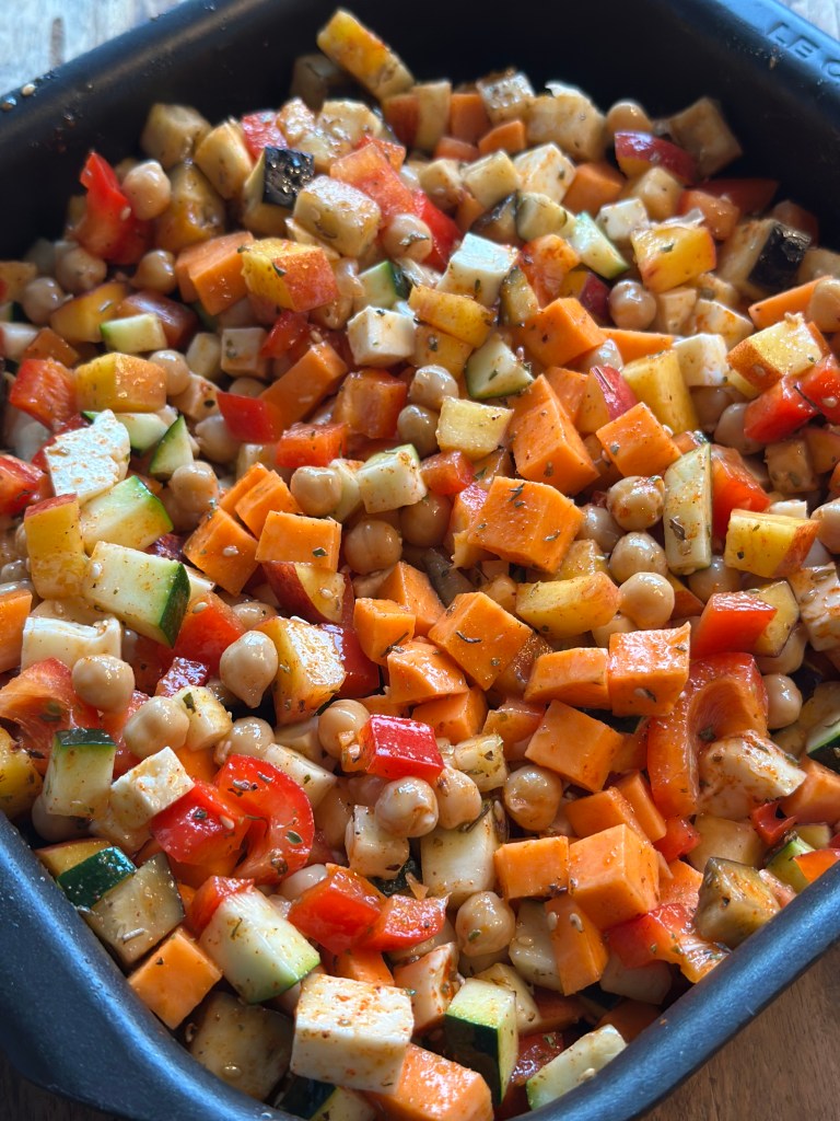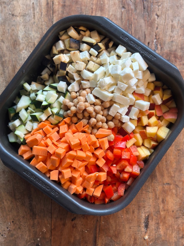 Alt skæres i tern – nogenlunde samme størrelse, krydres og kommer olivenolie over – blandes godt og i ovnen ved 220 grader i 30 minutter. Vend grøntsagerne hvert 10 minut.