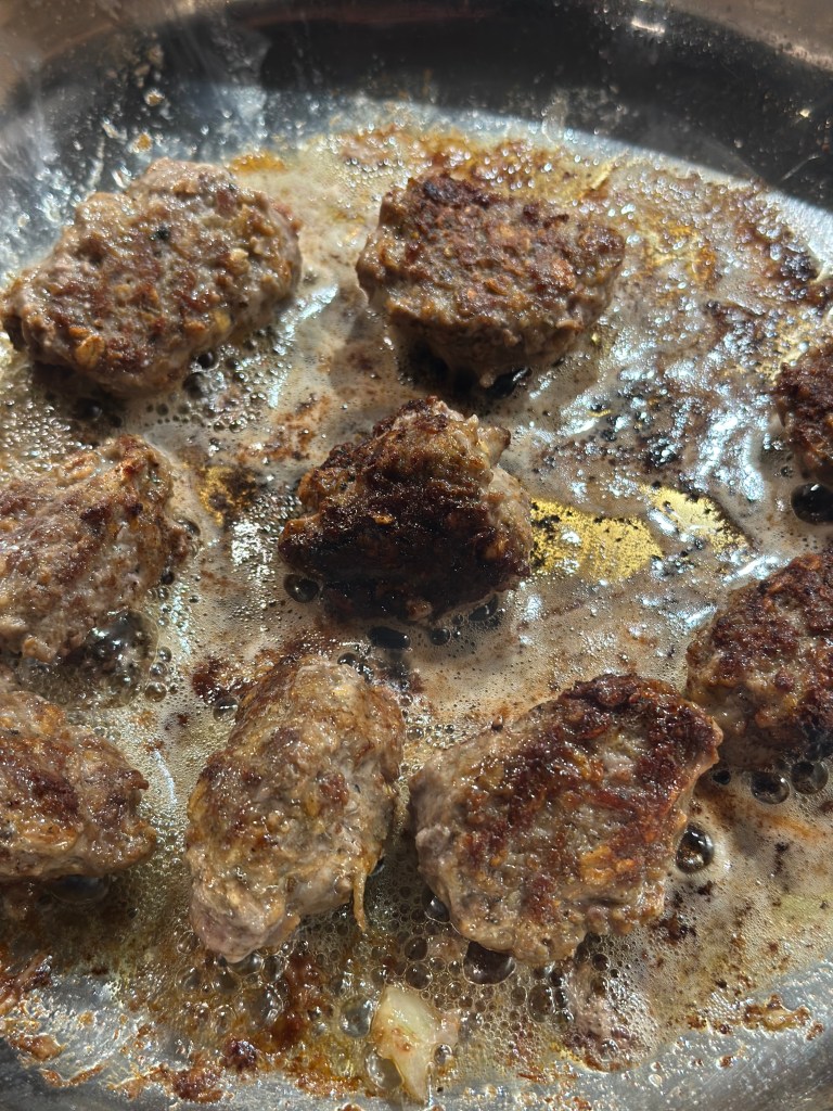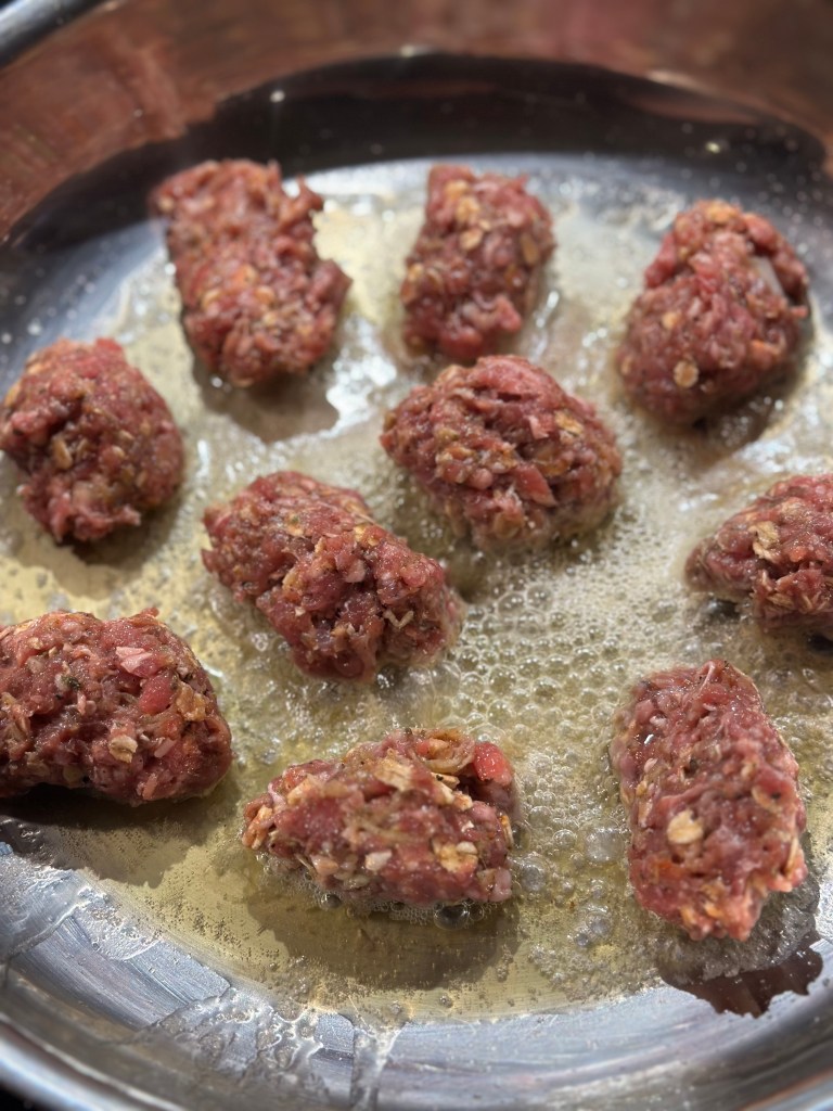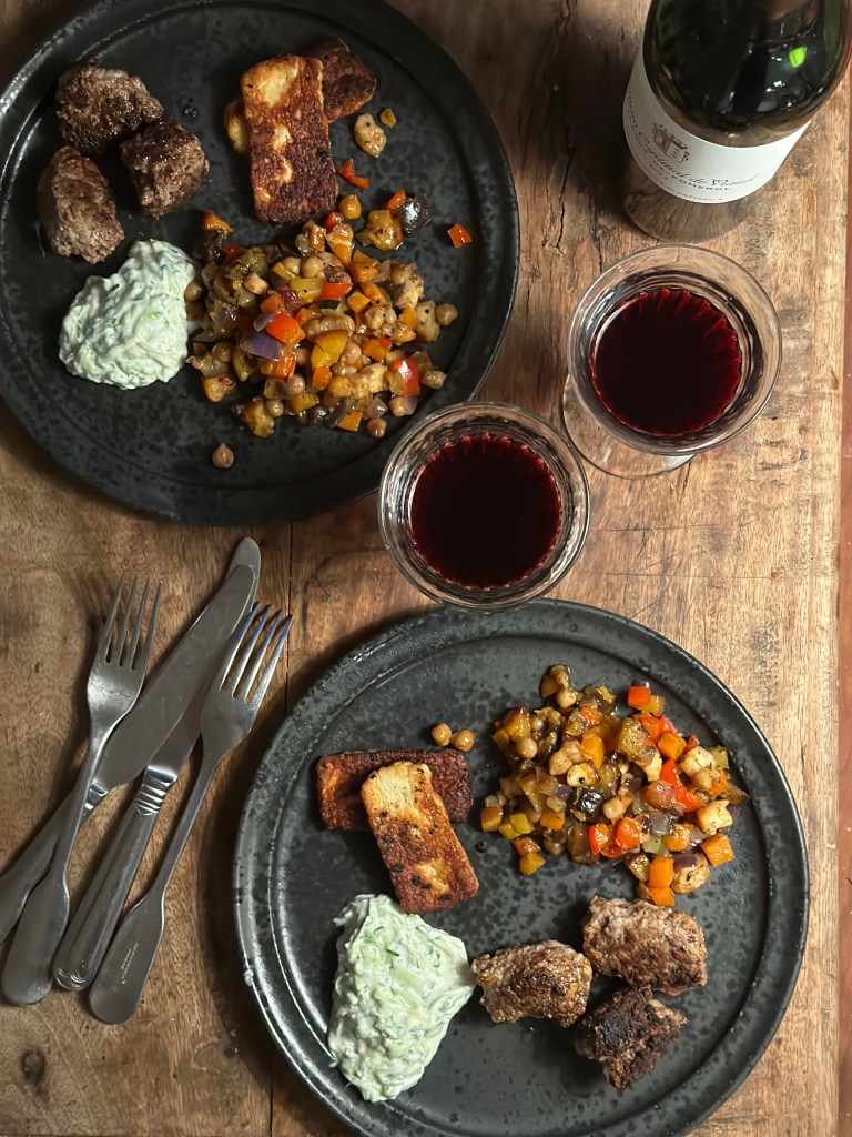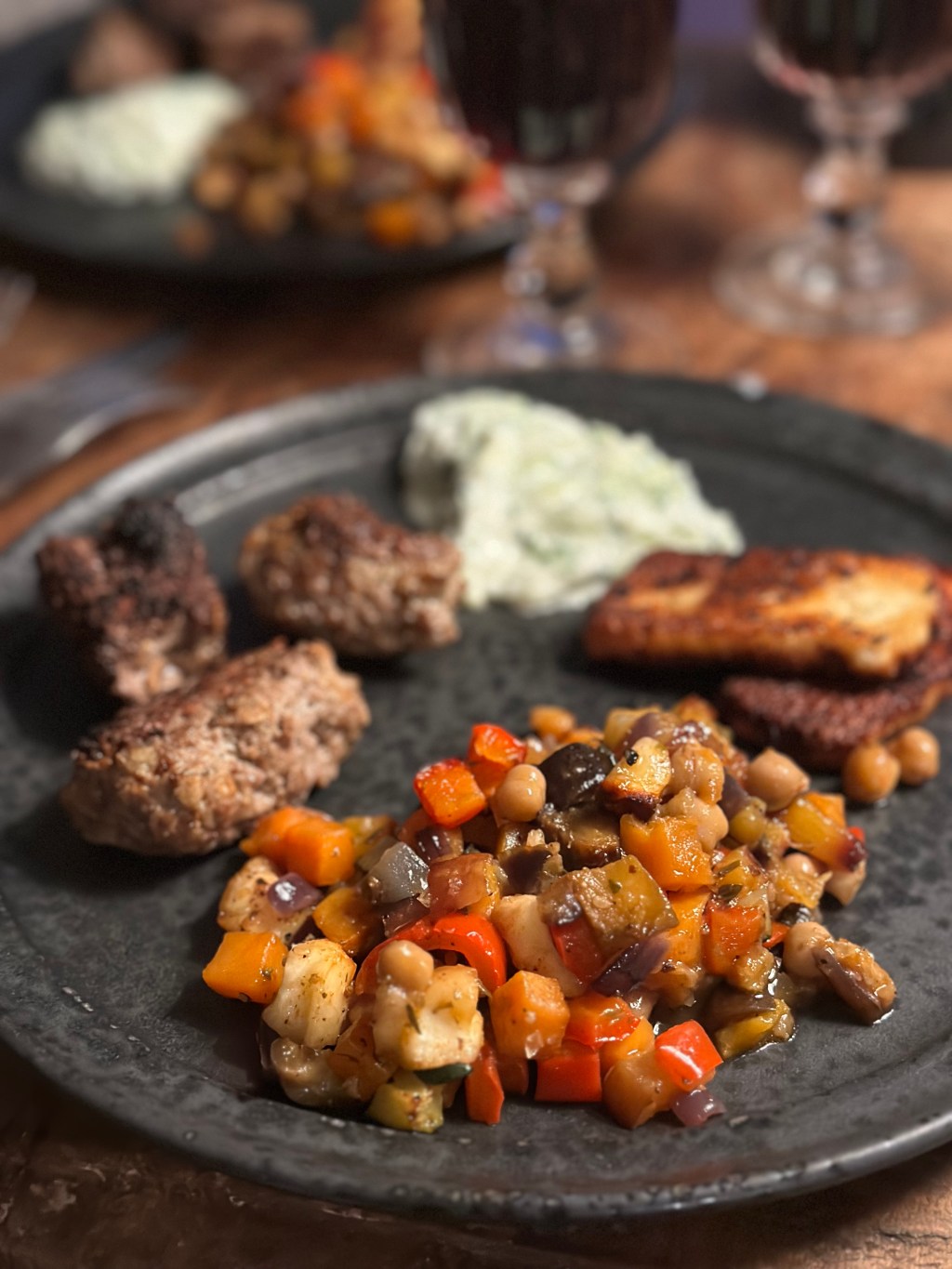Lammefrikadeller med persisk inspireret grøntsagspande er en fusioneret. Frikadellerne er egentlig græske. Grønstsagspanden er meget blandet, men krydderiet er fra mellemøsten. Tzatziki er græsk – så den samlede ret er vel ligeså græsk som mellemøstlig. Men alt smager vildt godt sammen, og det er en virkelig sund middagsret.