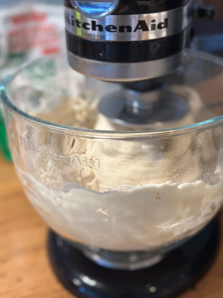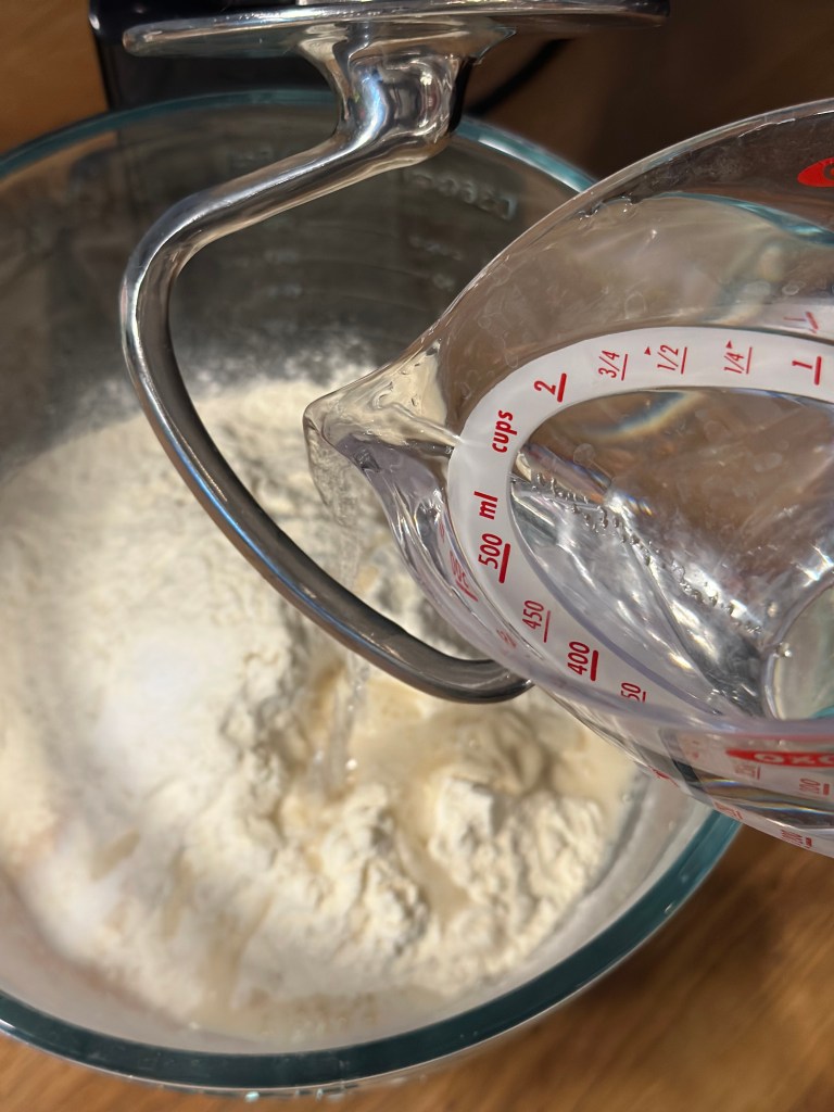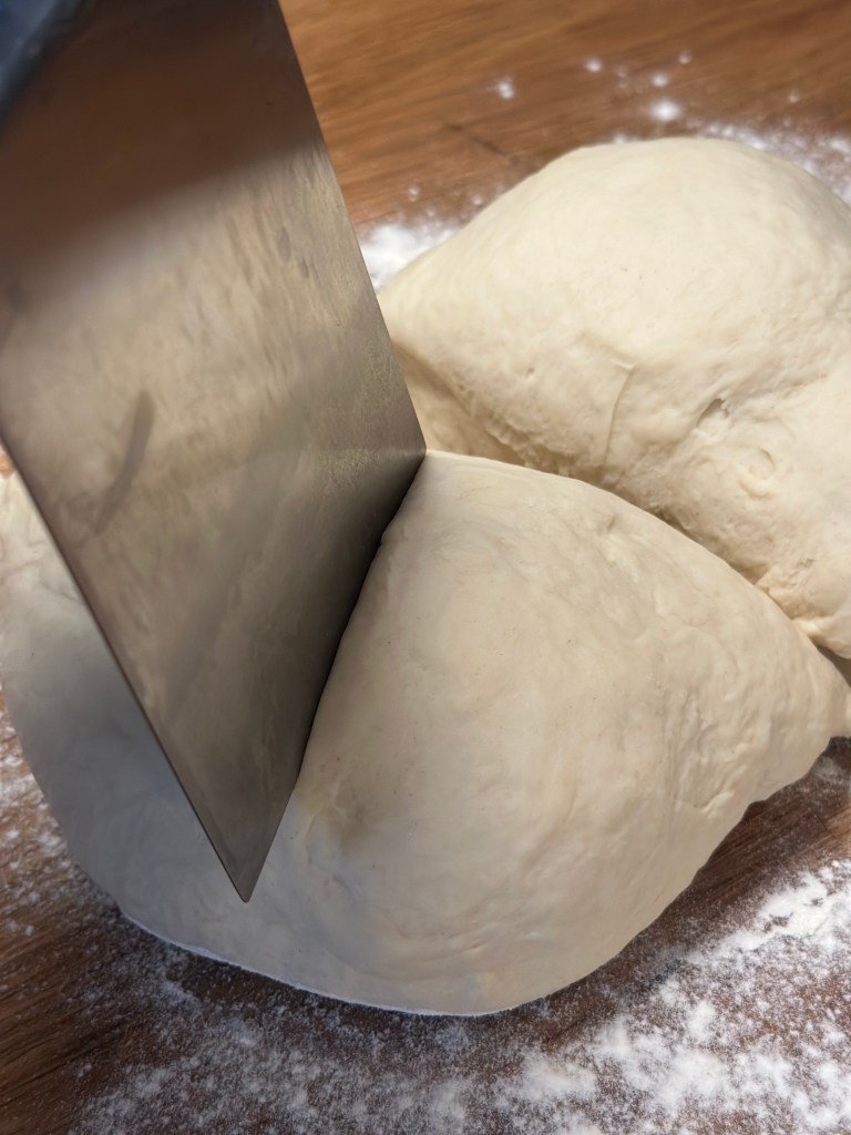 Det hele blandes godt i en røremaskine. Dejen æltes godt, deles i 4 stykker og foldes. Herefter på køl i mindst 8 timer. Når du tager den ud, skal du vente til den har stuetemperatur med at rulle den ud.