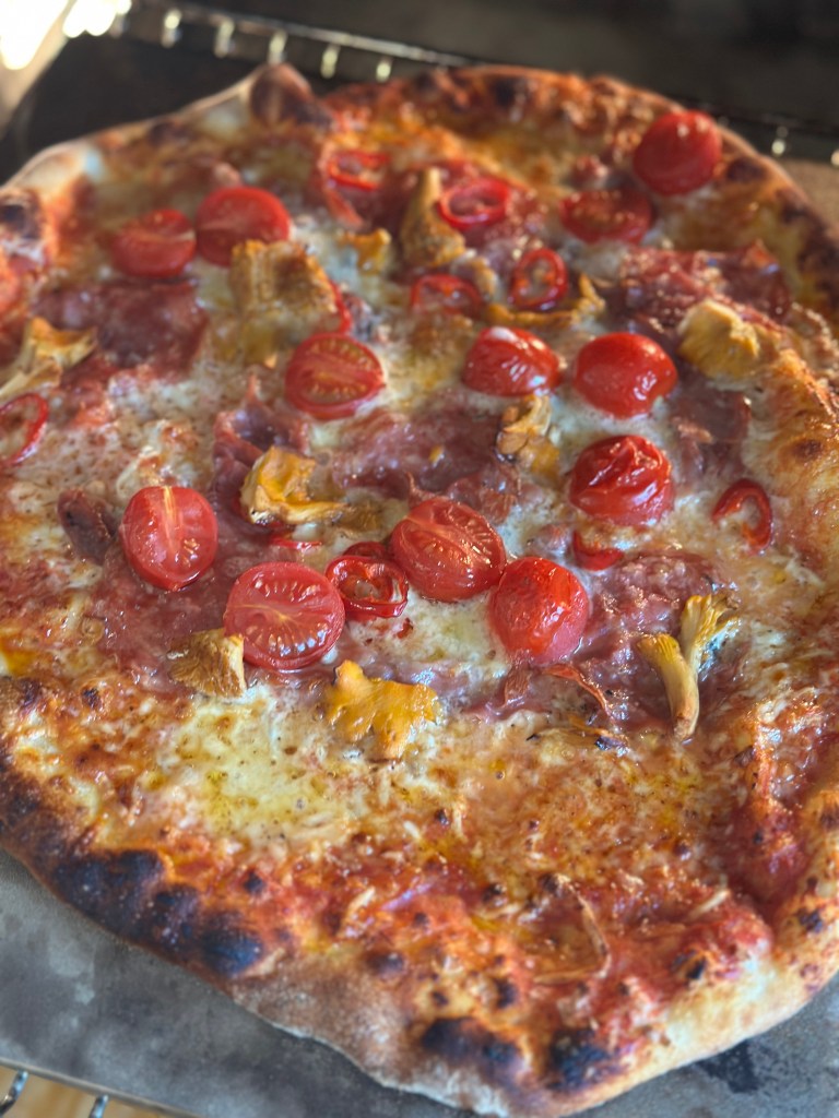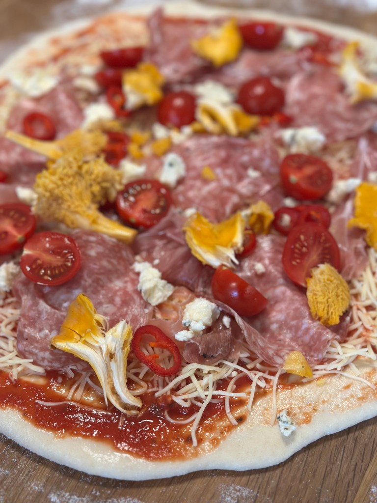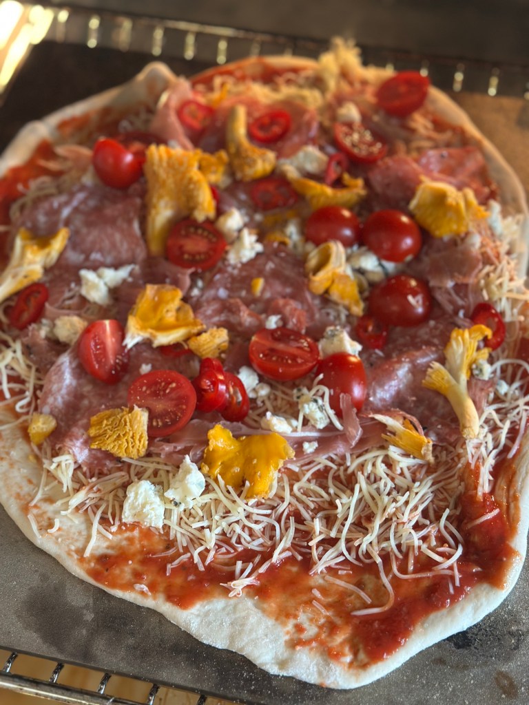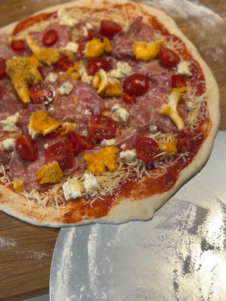 Fyldet kan du vælge selv – og dette er en version jeg er meget begejstret for. Osten er en kombination imellem mozzarella og Høgelund unika blåskimmelost. Topping er lige dele trøffel spegepølse og lufttørret trøffel skinke. Friske cherrytomater og kantereller. Og så lidt oregano og frisk basilikumblade.