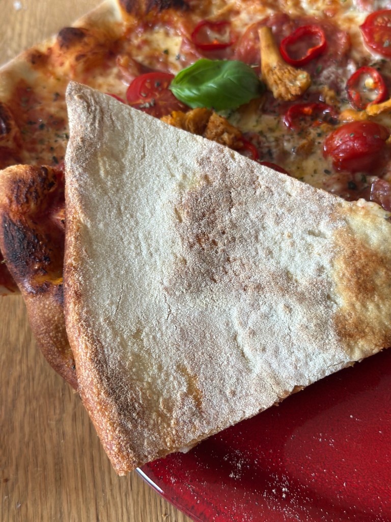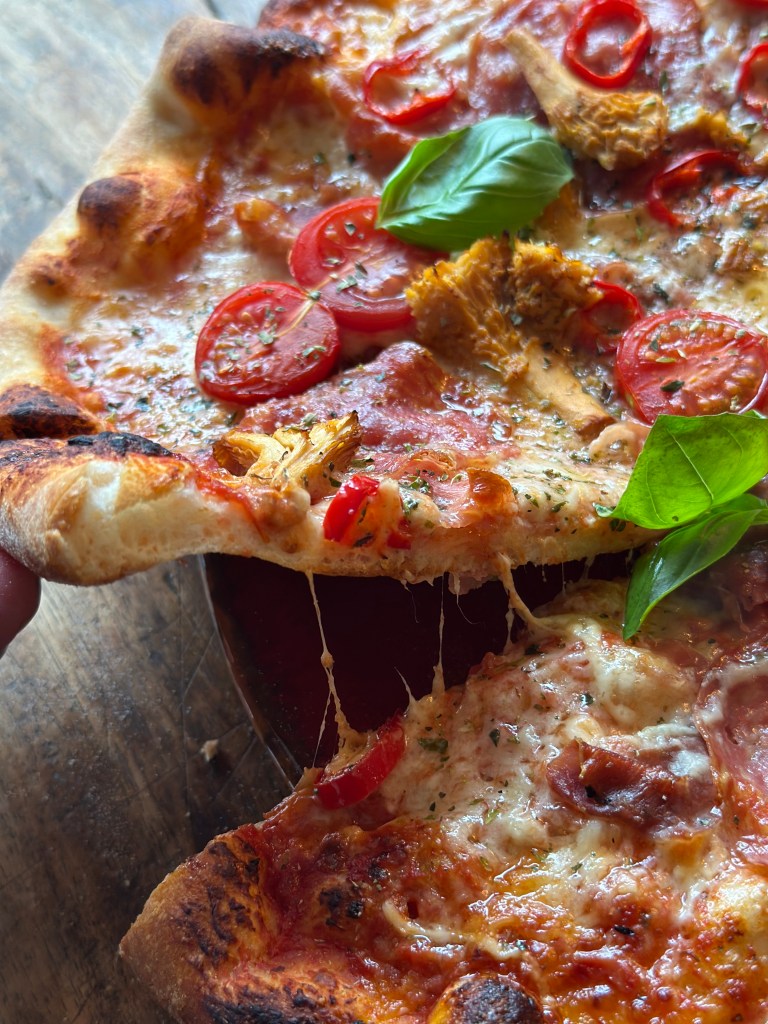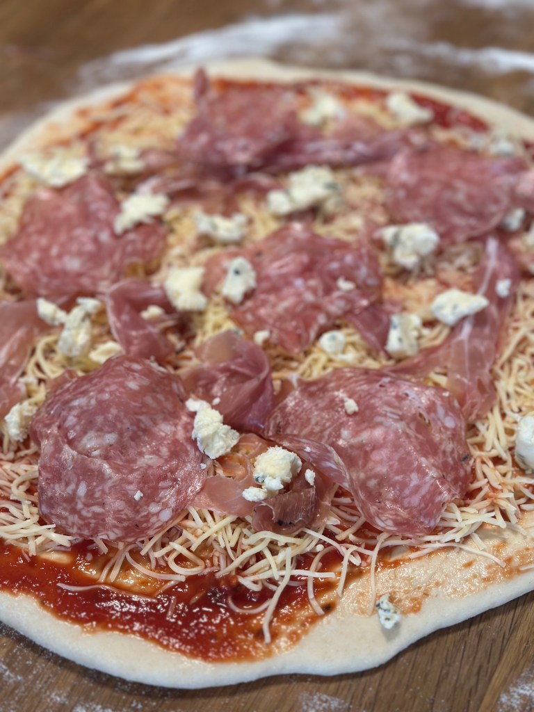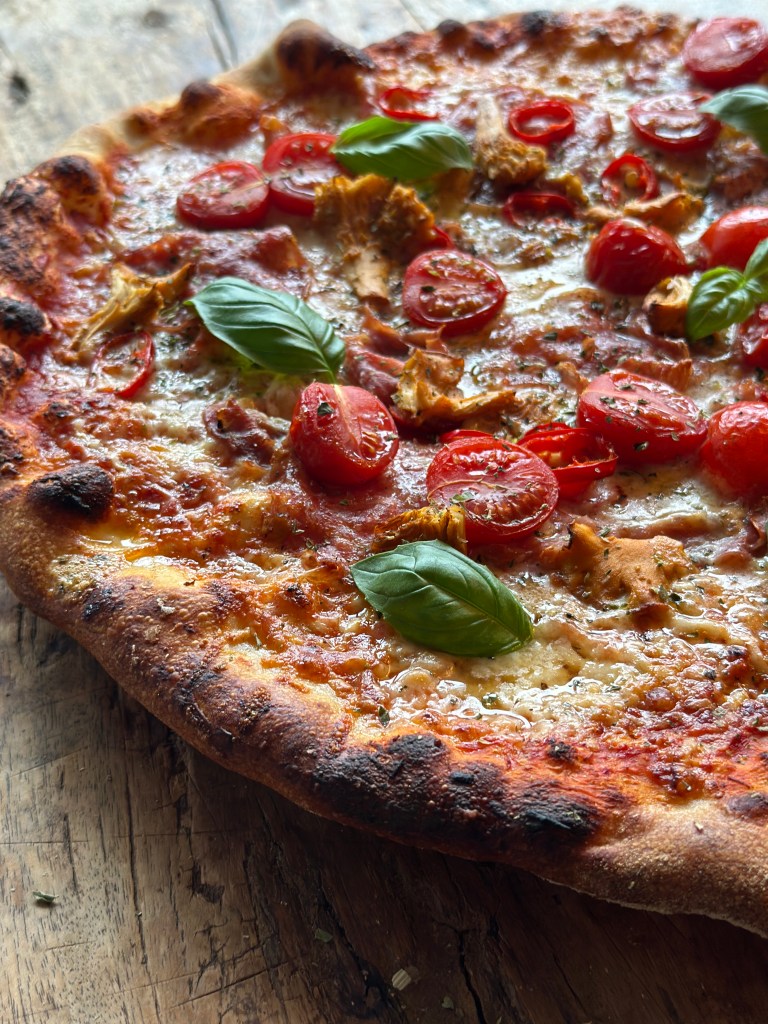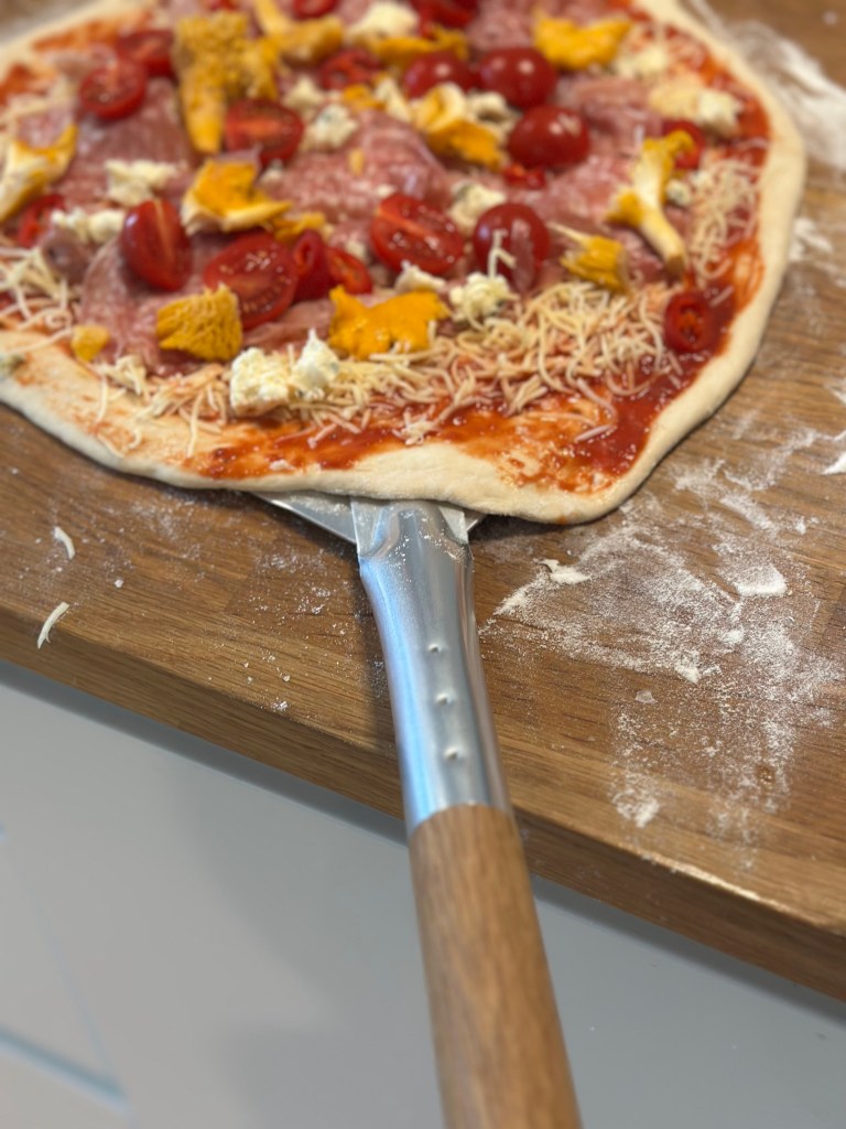 Fyldet kan du vælge selv – og dette er en version jeg er meget begejstret for. Osten er en kombination imellem mozzarella og Høgelund unika blåskimmelost. Topping er lige dele trøffel spegepølse og lufttørret trøffel skinke. Friske cherrytomater og kantereller. Og så lidt oregano og frisk basilikumblade.