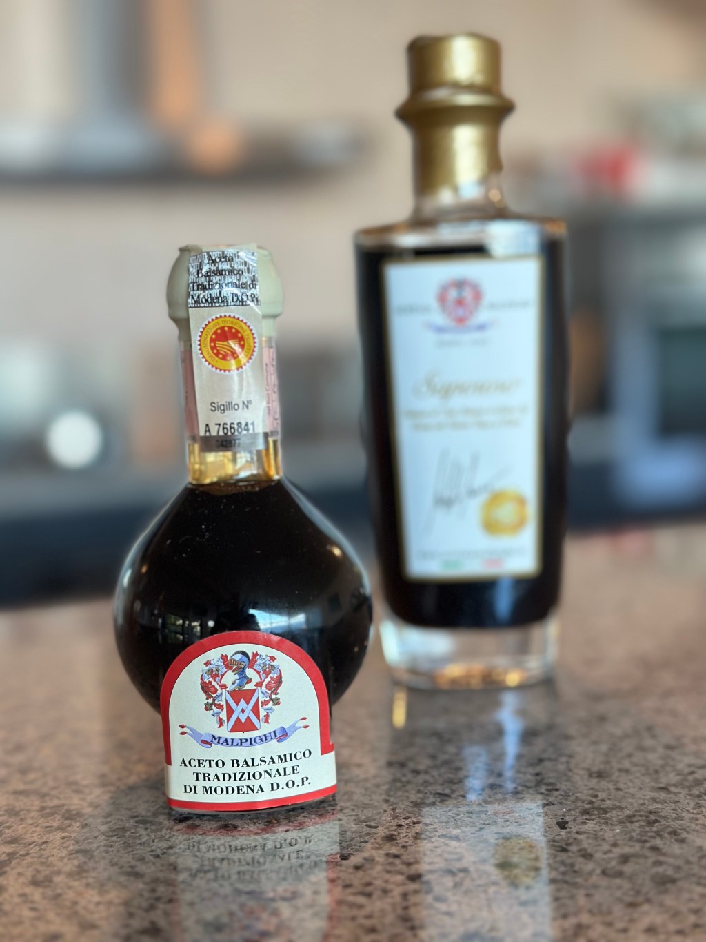 Der findes rigtig mange gode Balsamico. Jeg har både “toppen” og en god mellemvare. Det er dem jeg viser på billedet. Den en er 12 år og den anden er 8 år. Dem man normalt køber i supermarkedet kan også være gode, men er typisk 2-3 års udgaver – og ikke nødvendigvis det man reelt set vil kalde Balsamico.