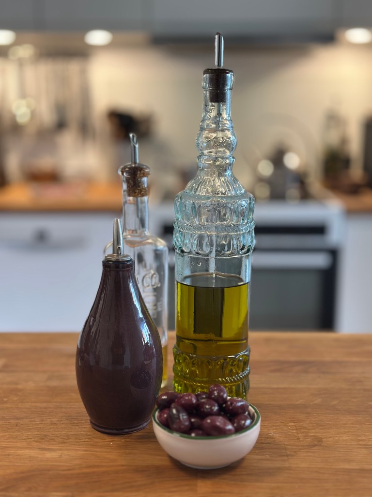 Jeg har altid to typer olivenolie på lager. Den ene en “slave olie” som stadig er bedste kvalitet, men allround. Den kan komme mange steder fra. Så har jeg en ekstragod olivenolie, som typisk er mere frugtig, grøn – og gerne fra Grækenland.