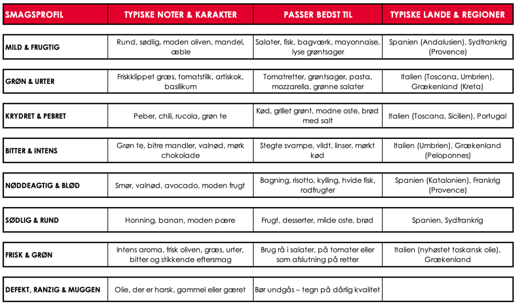 Ovenstående skema er kun vejledende. Der findes mange nuancer og varianter – og man kan ikke generalisere. Smagen afhænger af olivensort, modenhed, klima, jordtype og presningstidspunkt. Ligesom vin har olivenolie “terroir” – altså smagskarakter fra stedet, hvor oliven vokser. Men prøv dig frem og brug skemaet som guide.