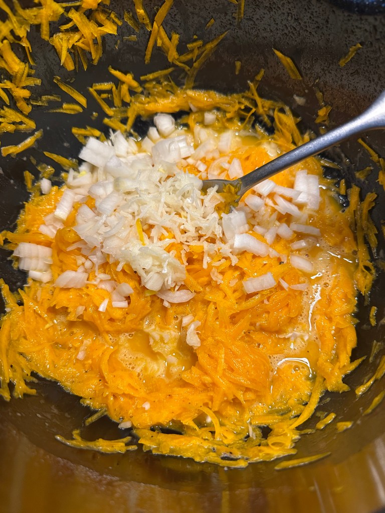 Tag skallen og kernerne væk fra hokkaidoen. Riv den ned i godt pisket æg og mel. Hak løget og riv hvidløget. Tilsæt de øvrige ingredienser.