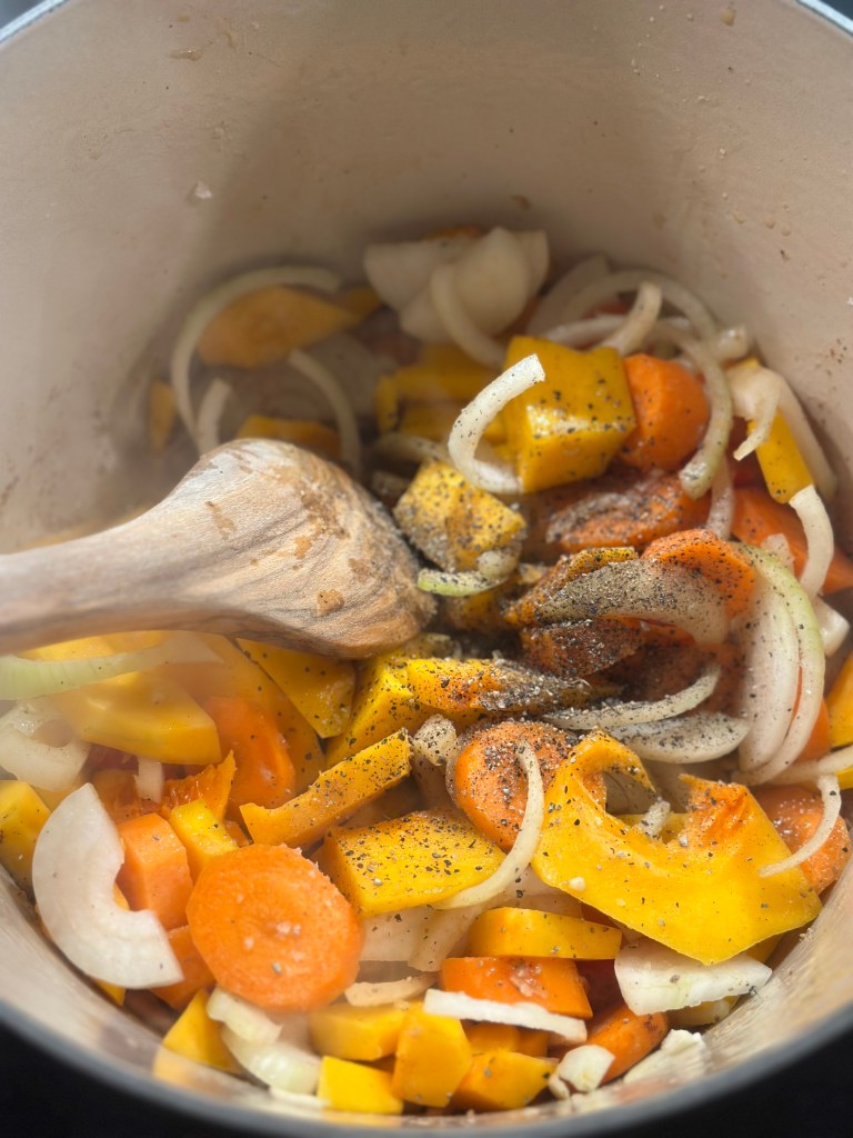 Forbered grøntsagerne, ved at skralde og skære i mindre stykker. Hak løgene.