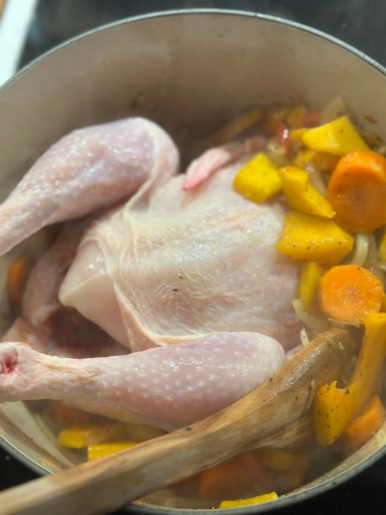 Smelt smøret og alle grøntsagerne i – undtagen ddn røde peber. Lad dem arbejde lidt indtil de bliver blanke. Skub grøntsagerne til side og kom kyllingen i. Brun den på hver side. Tilsæt salt og peber.