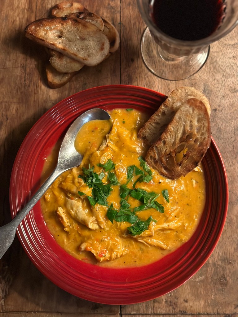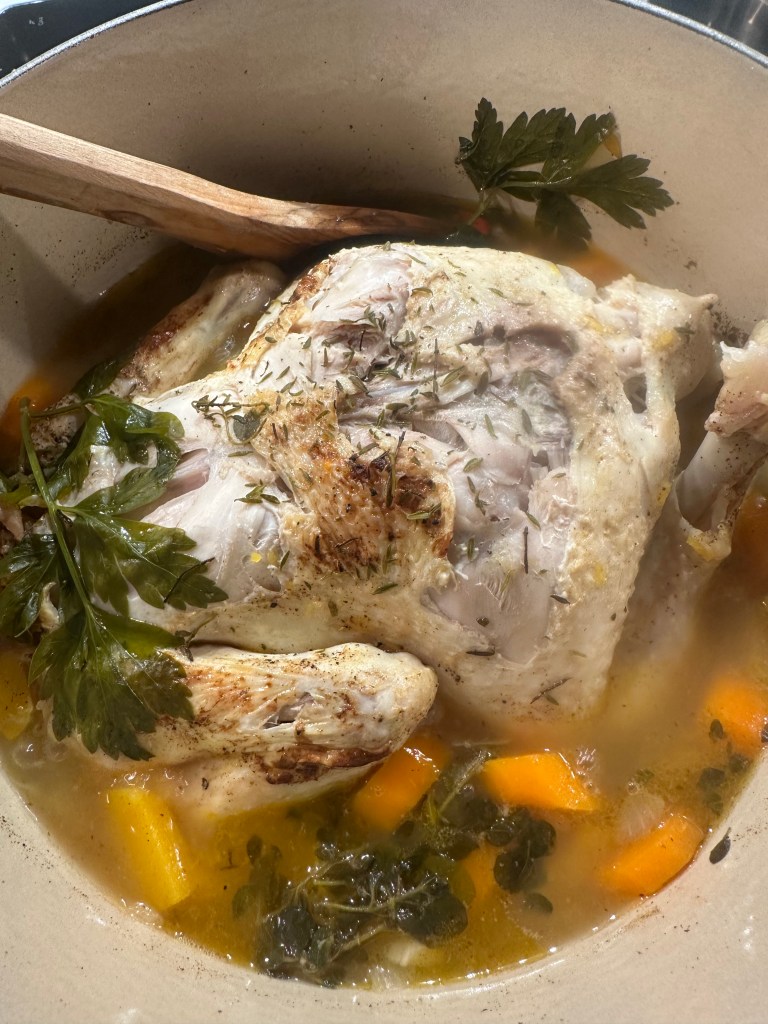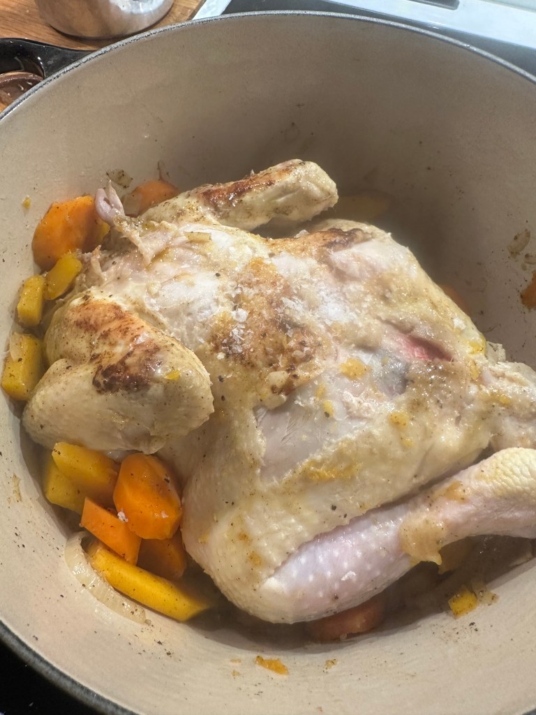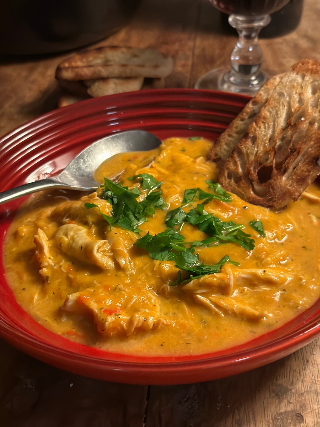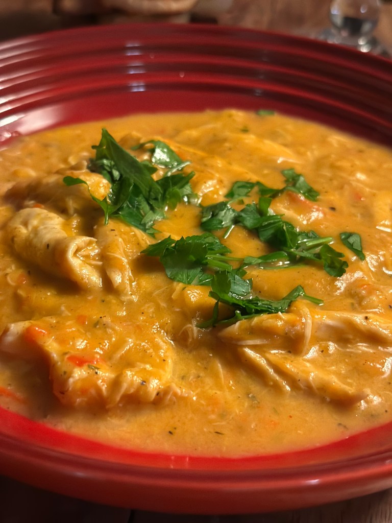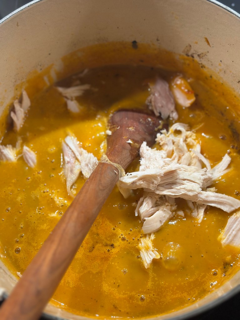 Smag til med salt, peber og fløde. Når du kan lide smagen, plukker du kyllingen og kommer den i gryden uden skind. Varmer det hele igennem, og den er klar til servering.