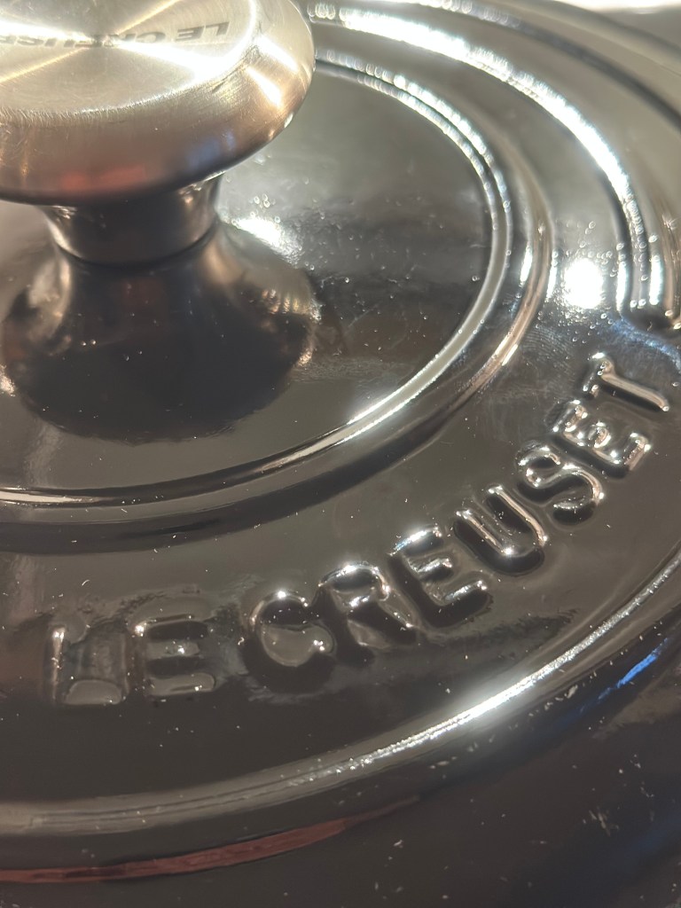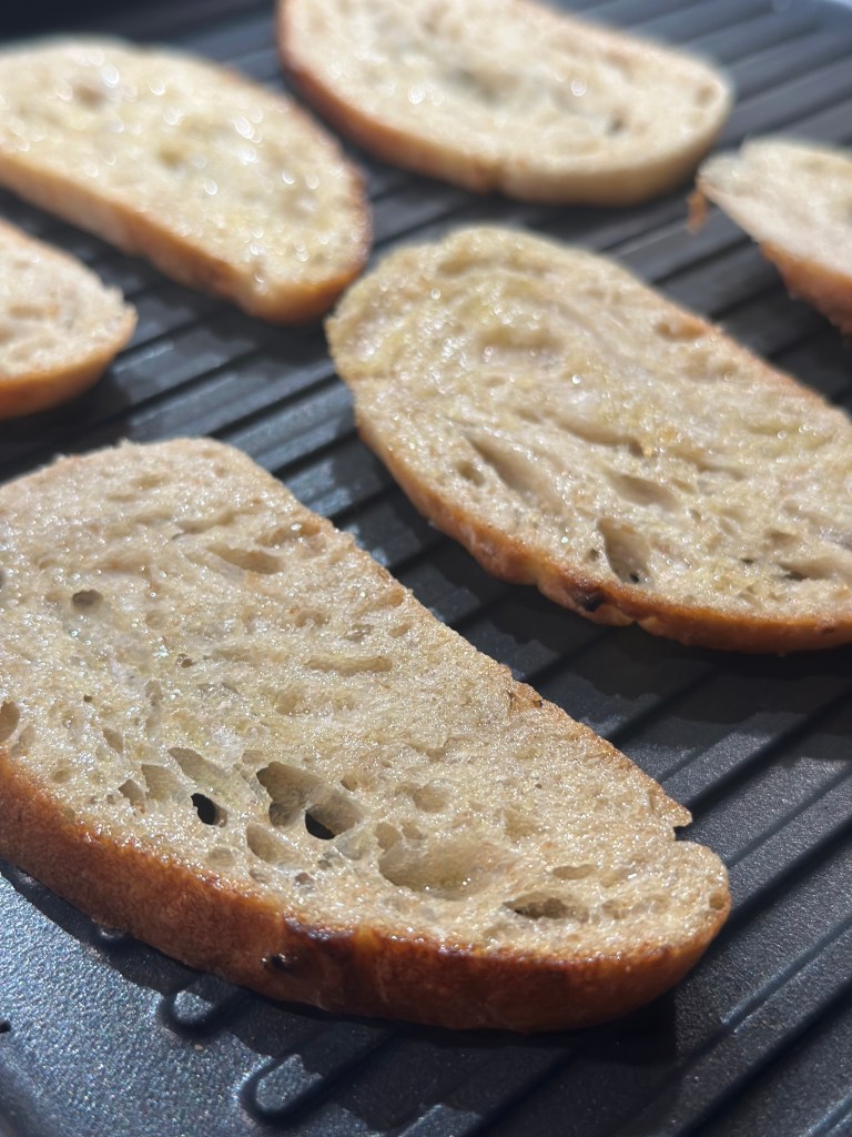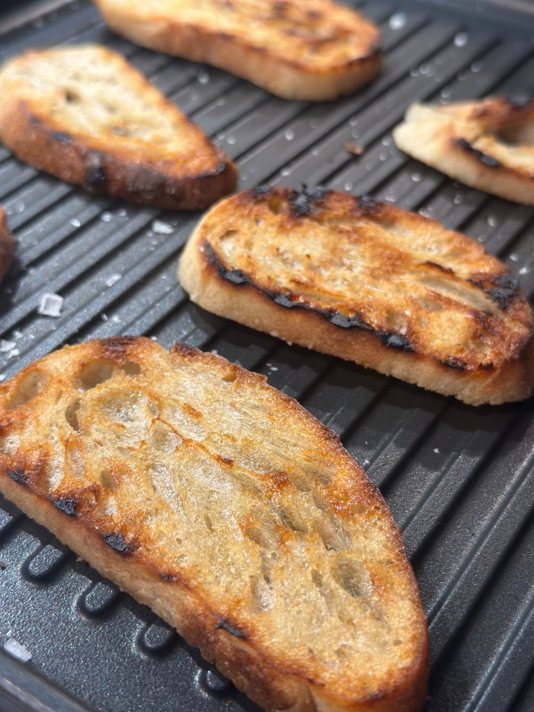 Jeg serverer i en dyp tallerken fra LeCreuset – farven er cerise og modellen er signatur. Den er en del af mit samarbejde med LeCreuset. Brødet er en af mine surdejsboller som jeg har skåret ud som små brød og kommet på en grillpande – blot sprayet med olivenolie.