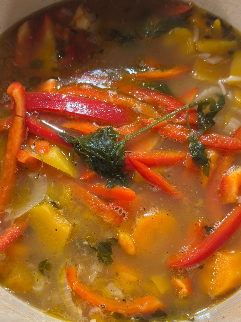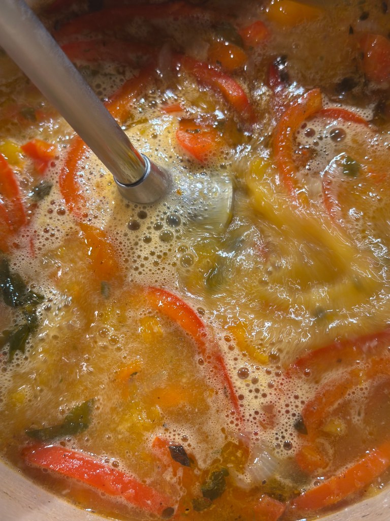 Efter ca. 45 minutter kommer du peberfrugten i, og lader den simre i yderligere 15-20 minutter.