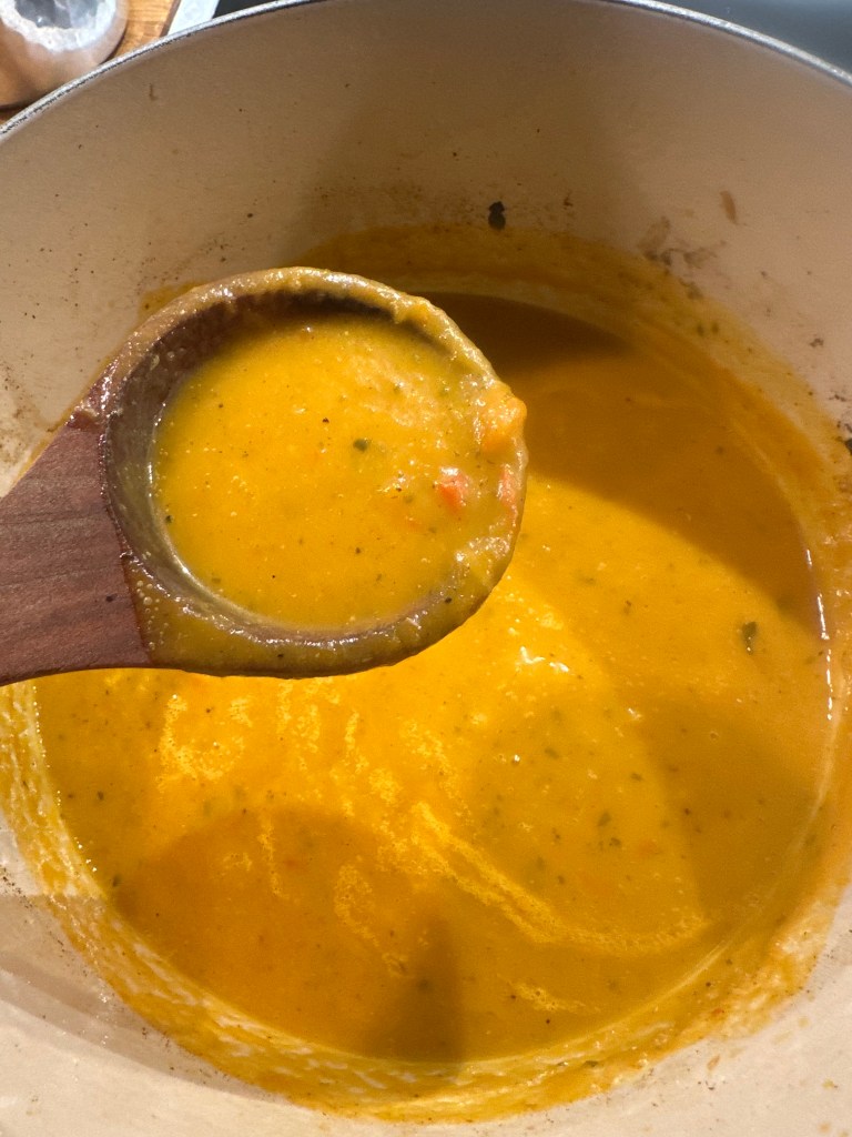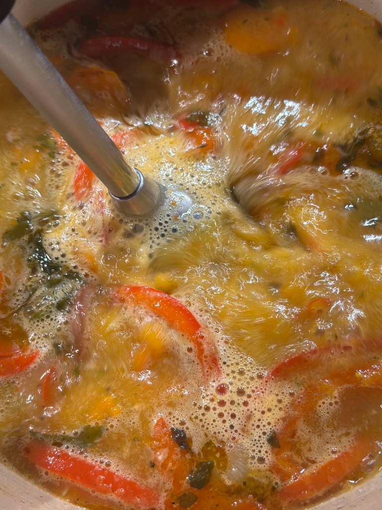 Tag kylligen op, og fjern timian stilken. Herefter brug en stavblender til at gøre suppen smooth. Jeg kan godt lide der stadig er lidt stuktur, men det er en smagssag.