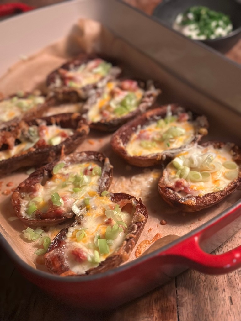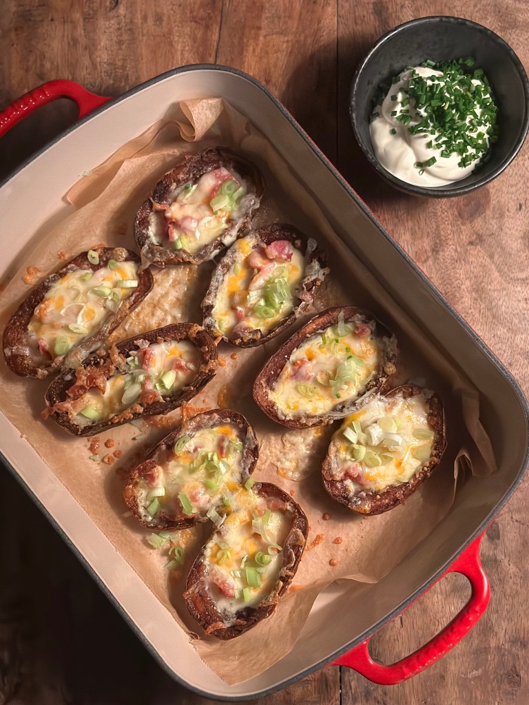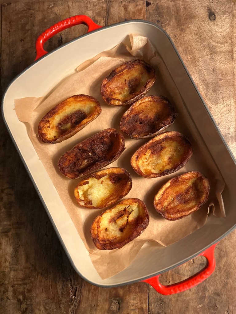 Bag kartoflerne i en times tid i ovnen. Lad dem køle lidt, skær dem over og tag noget af indmaden ud med en ske – jo mere fyld jo mere mætter de. Omvendt, hvor du går helt til kanten, bliver de næsten for sprøde.