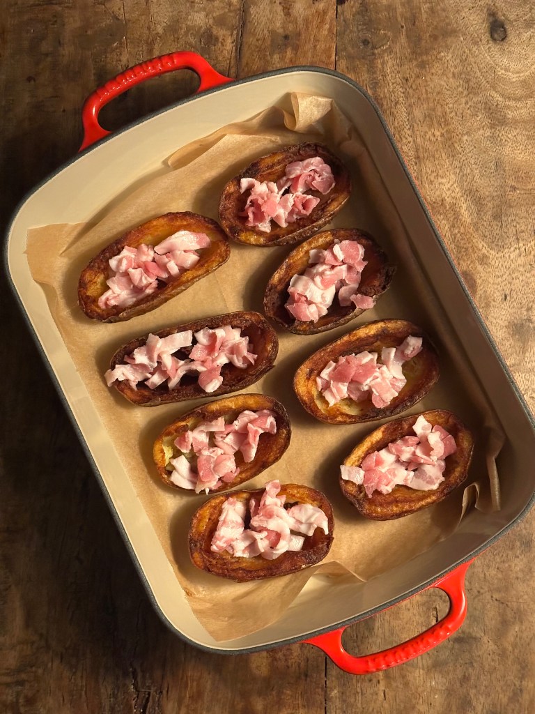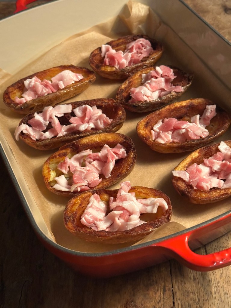 Kom den i friture ved ca. 160 grader til de er gyldne. Tag dem op og sæt dem på en LeCreuset bradepande i emaljeret støbejern. Kom bacon i udhulningen og kom dem i ovnen til baconen er let sprødt (du kan også vælge at stege baconen på panden). Herefter kommer du osten på – og ind i ovnen igen – blot 6-8 minutter ved 200 grader. Du kan se på dem, når de er færdige – og det er op til din smag hvor meget osten skal gratineres.