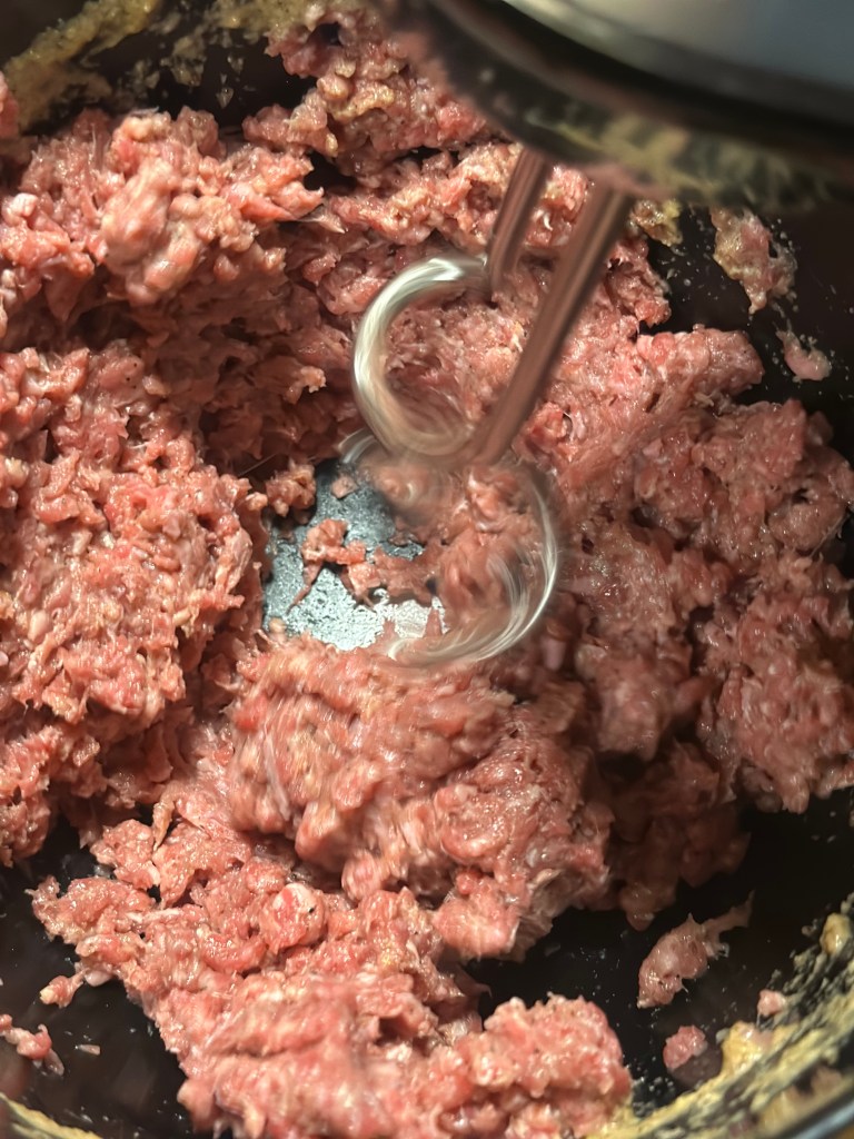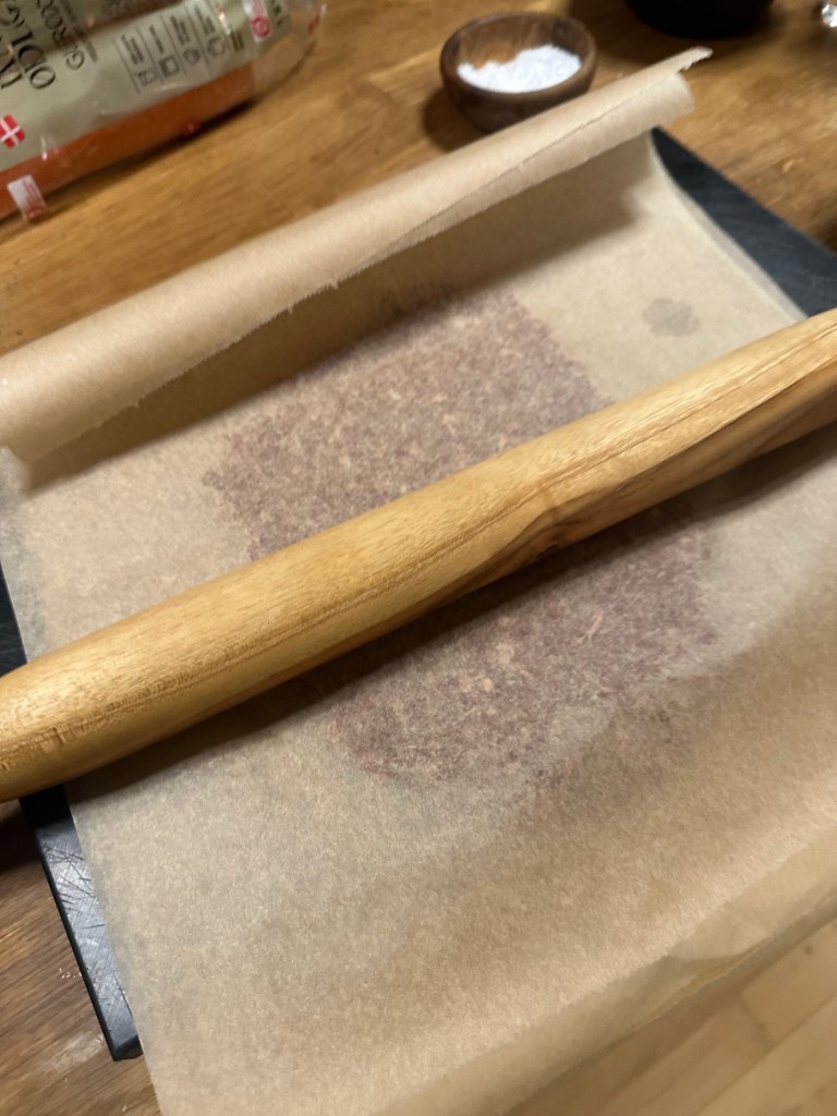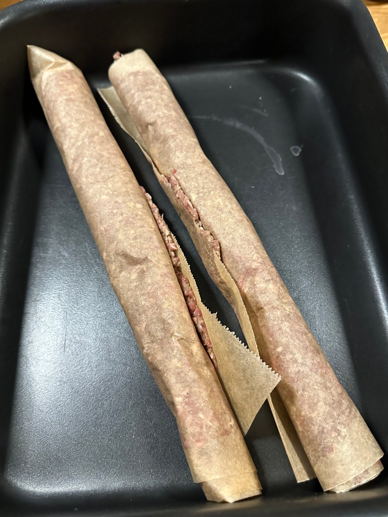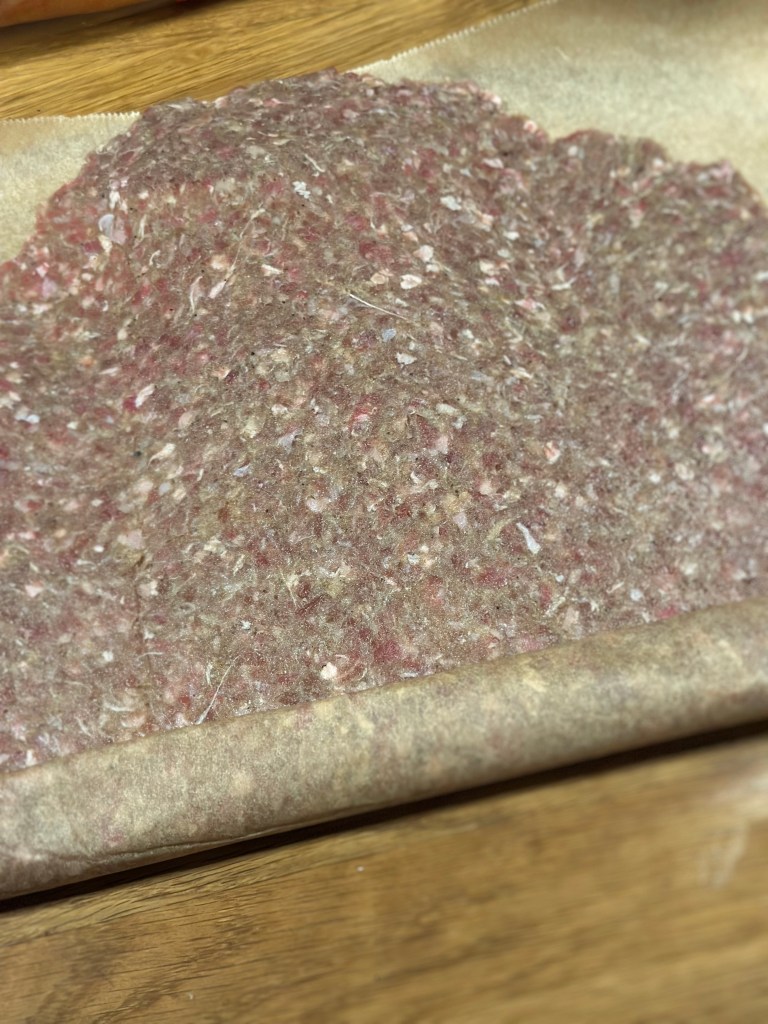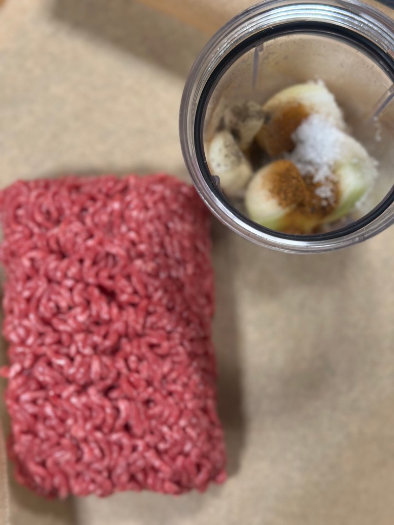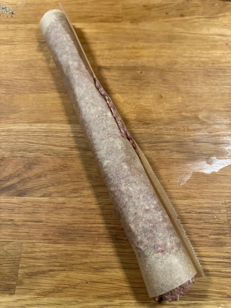 Blend først løg, hvidløg, krydderier og olivenolie. Rør farsen med blandingen til den er sej. Del den i to, og hver del passer til et stykke bagepapir.