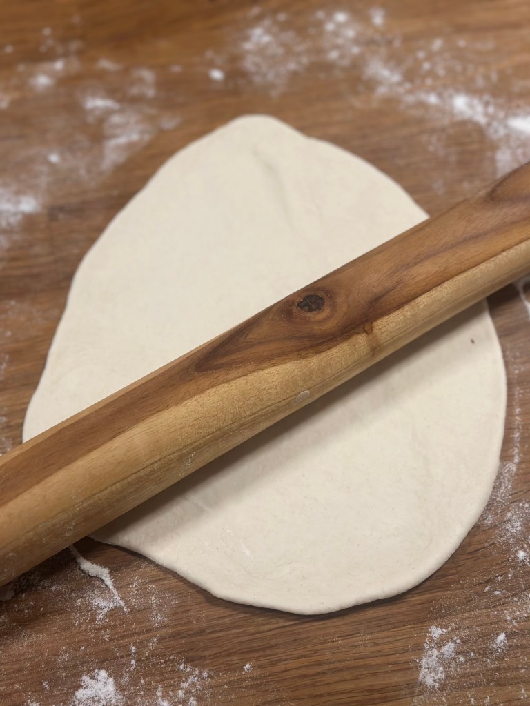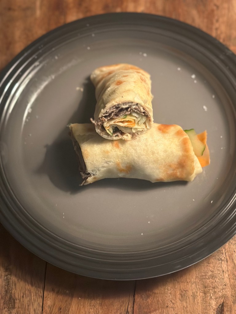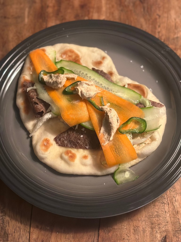 Jeg kommer i fladbrød i lidt større størrelse – se opskrift her. Salaten her, er blot revet agurk og revet gulerod – samt lidt grøn iceberg. Og så lidt frisk jalapeños.