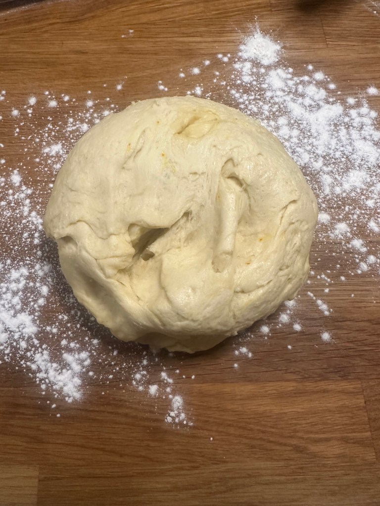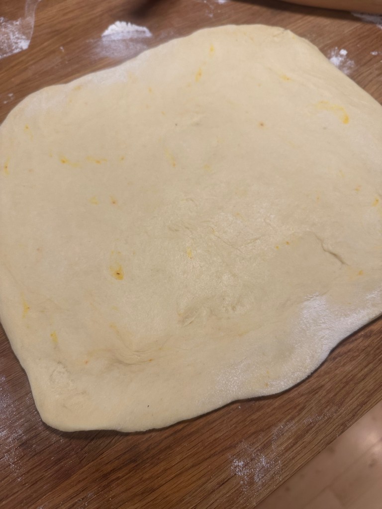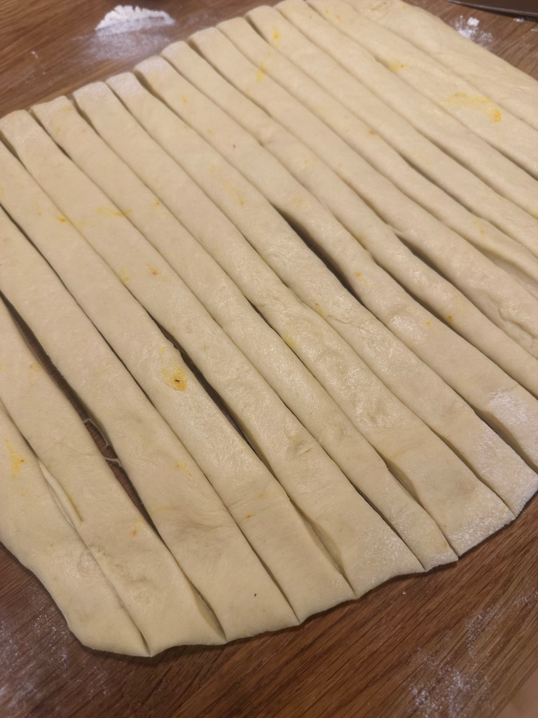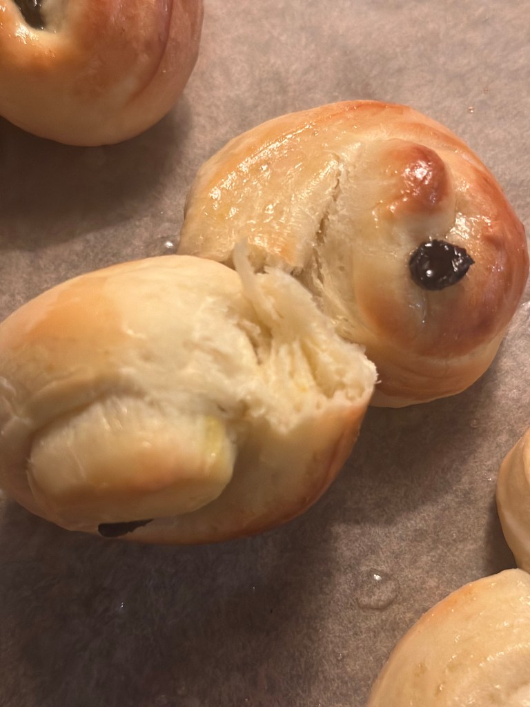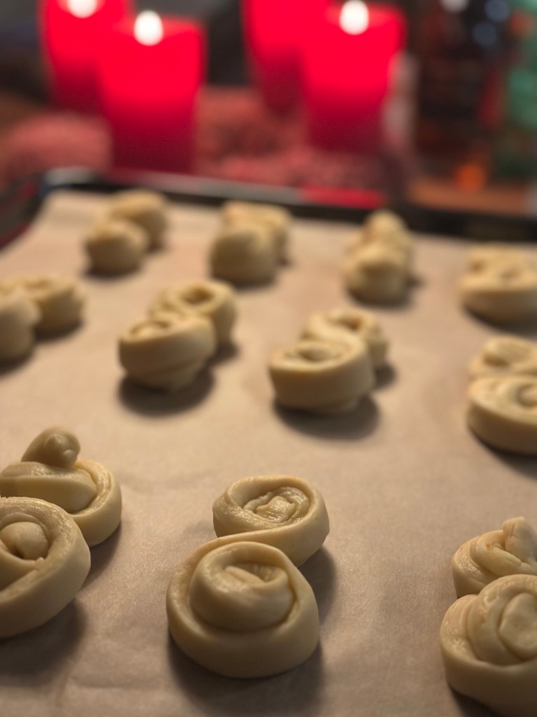 Rul dejen jævnt ud, og således den næsten er en firkant. Skær i tynde strimler, og så rulle man strimlen sammen som et “S”. Kom på en bageplade, pensle med pisket æg, og placer en rosin eller en korend i hvert “øje”.