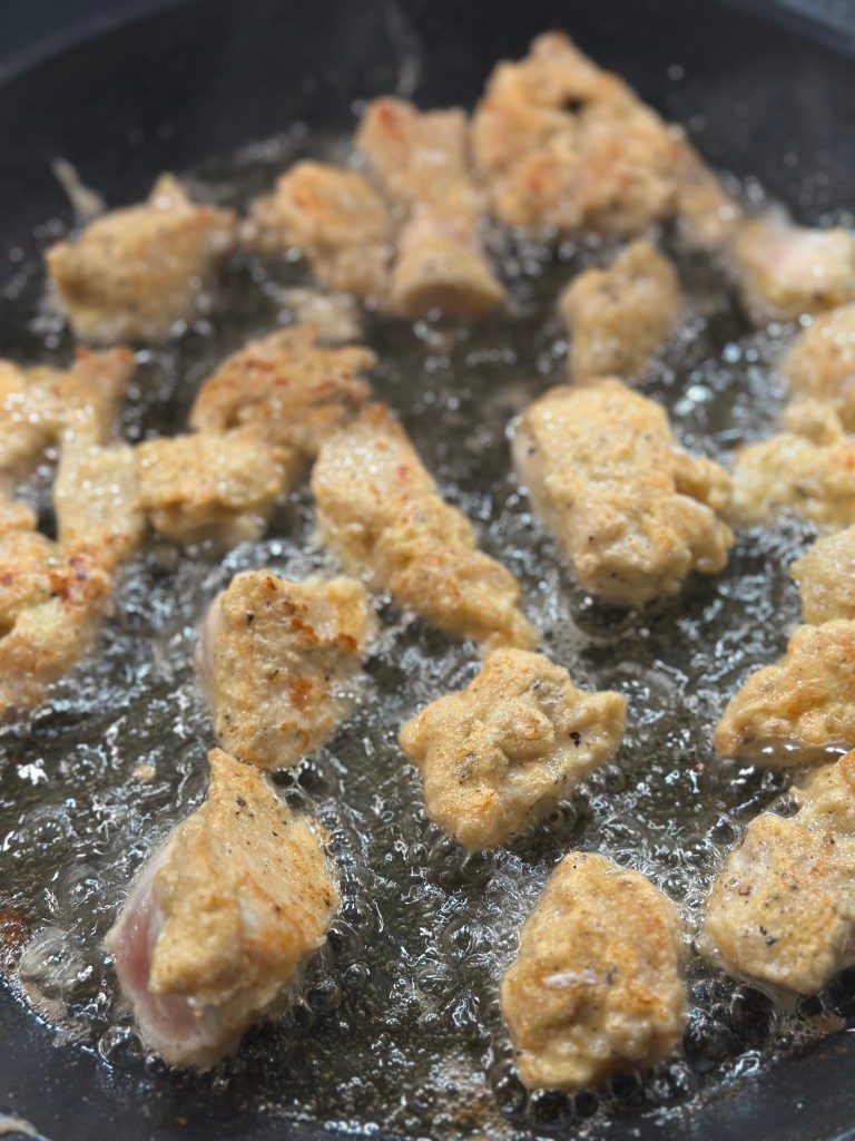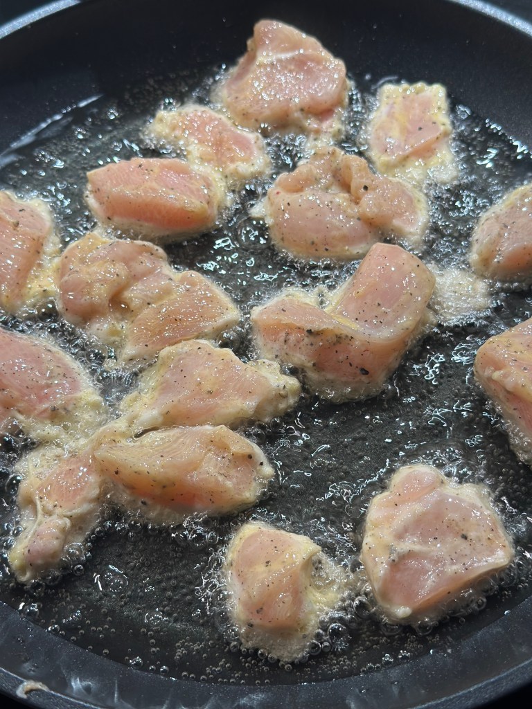 - Steg kyllingen. Varm olien op i en stor pande eller wok ved middel-høj varme. Steg kyllingen gylden og sprød. Tag den af panden og læg til side.