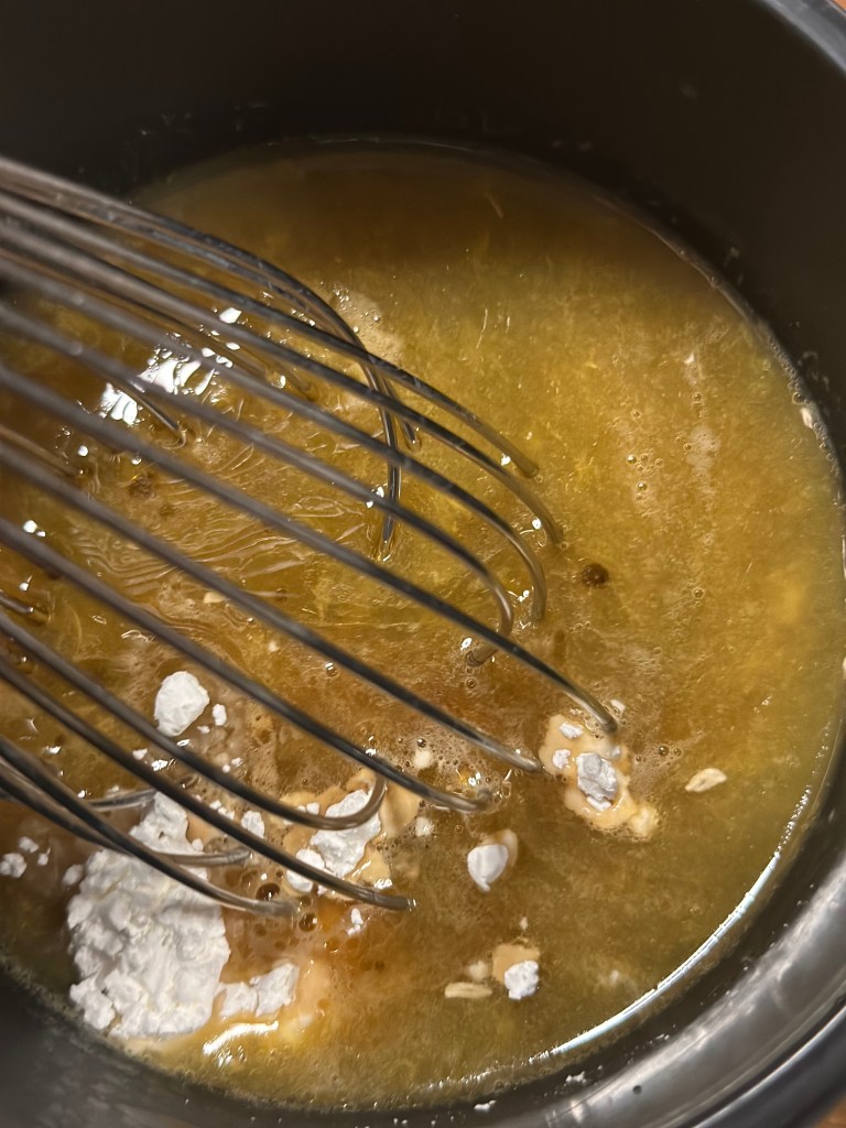 - Lav saucen. Rør appelsinjuice, riseddike, brun farin, hvidløg, majsstivelse og sojasauce sammen i en skål.