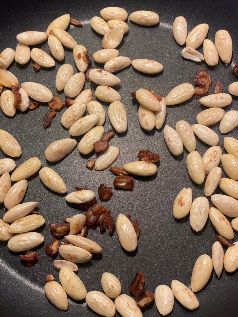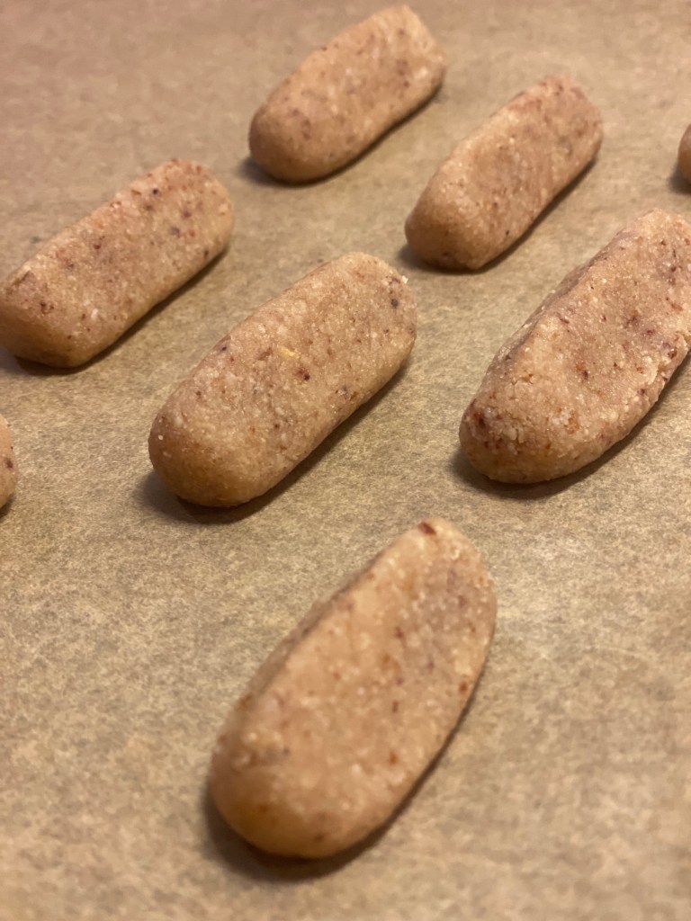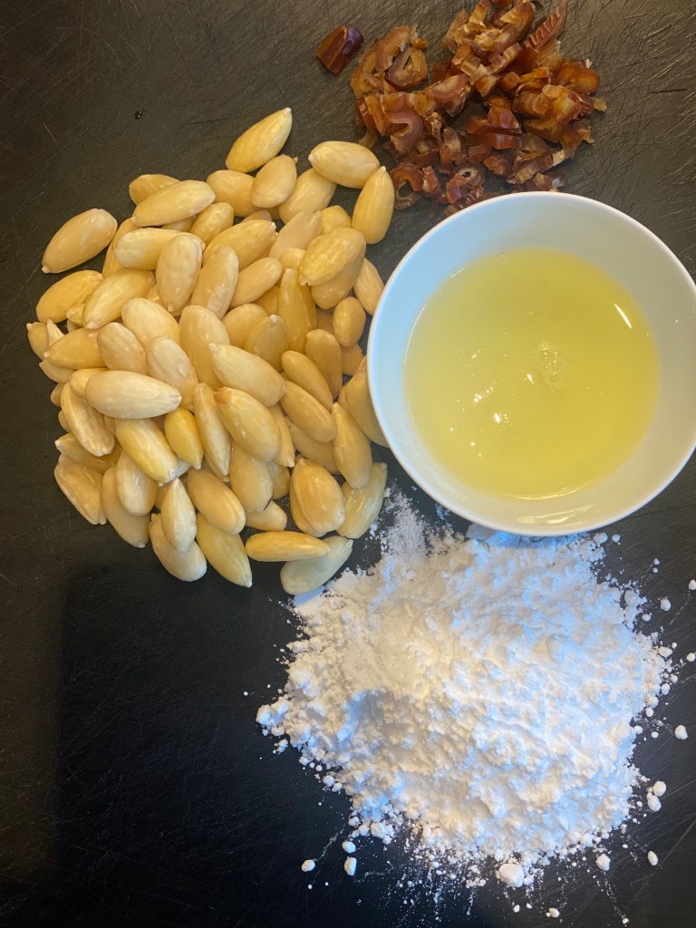 Hak Dadlerne og rist dem sammen med mandlerne på en tør pande. Alle ingredienser blendes (nøjes med 3/4 æggehvide til at starte med), blend så fint som muligt og ælt resten i hånden. Vurder om resten af æggehviden skal tilsættes. Dejen bliver lidt klisteret.