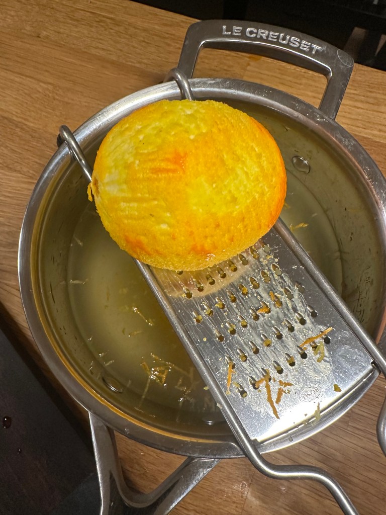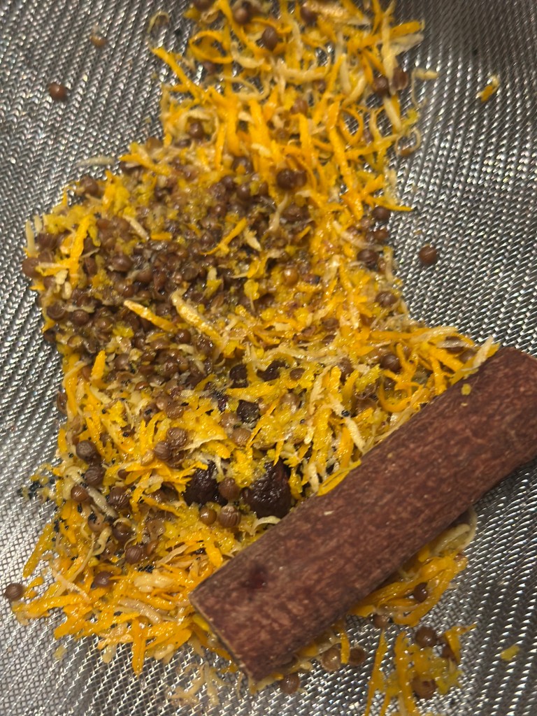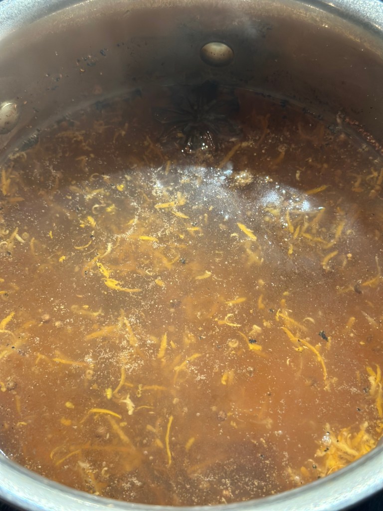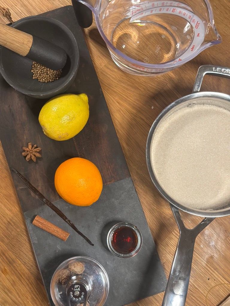 - Kom vand, citrus-skaller og krydderier i en gryde