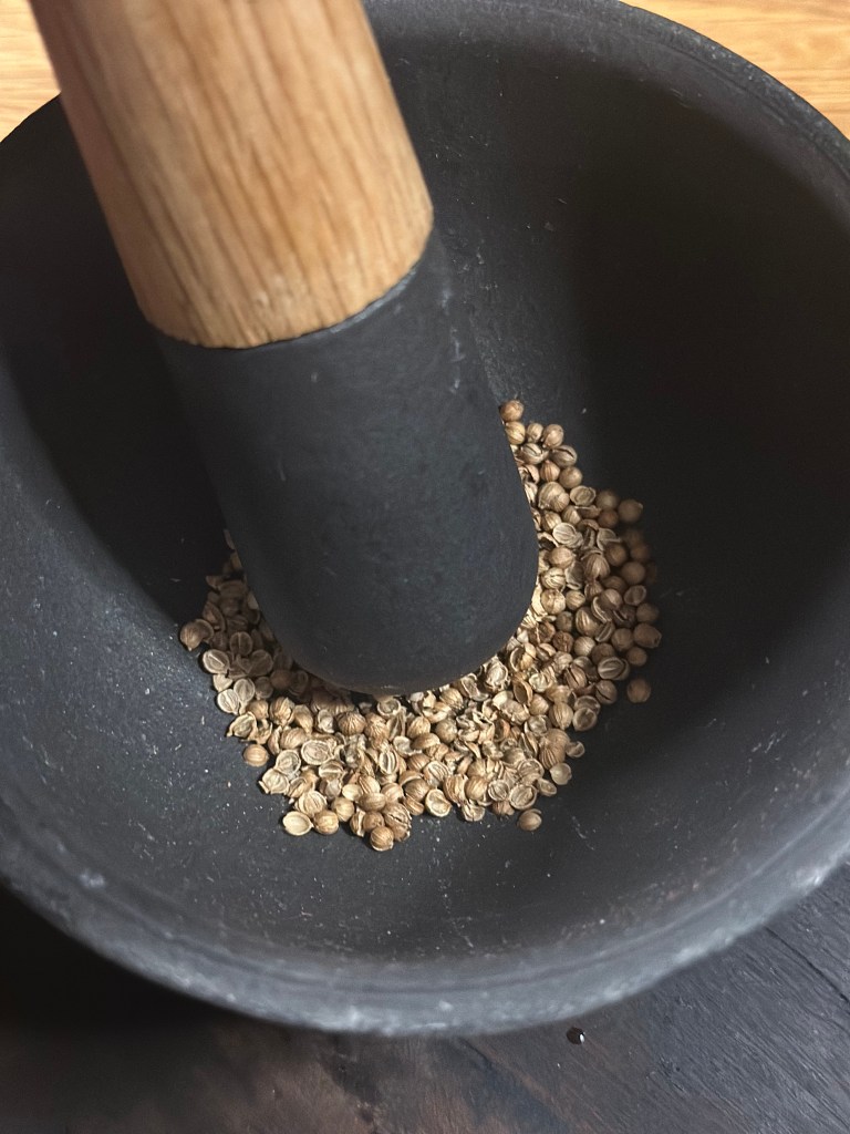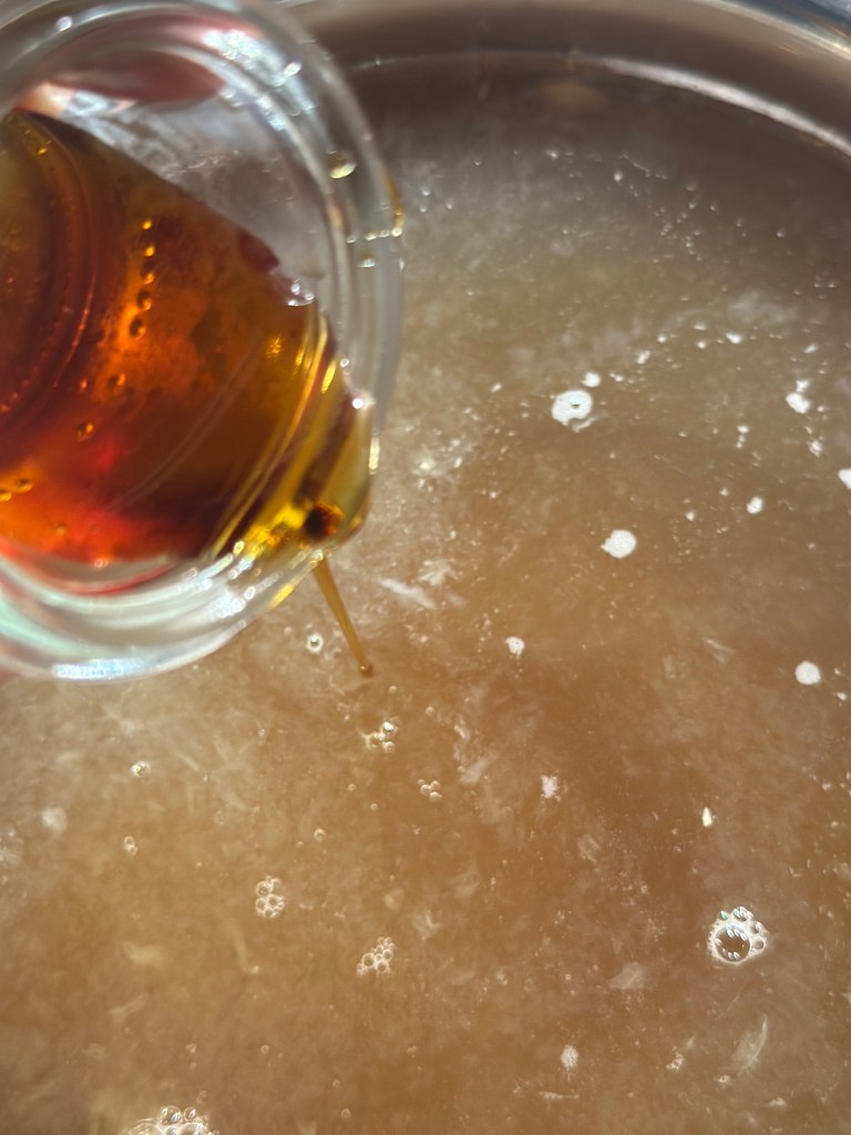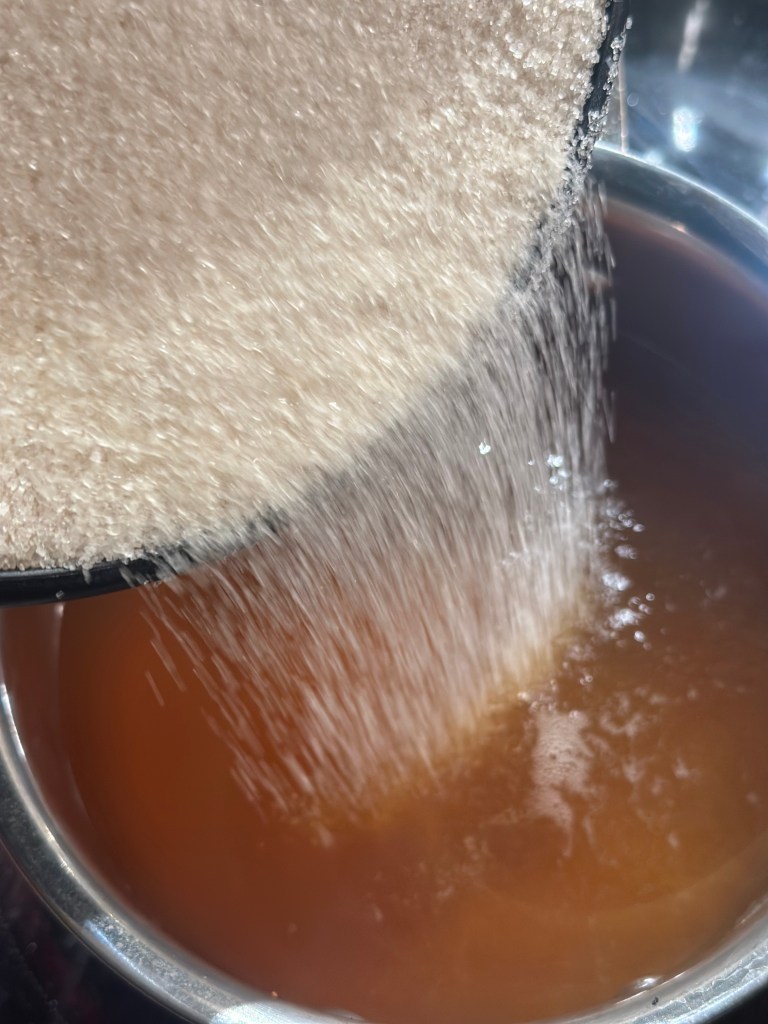 - Når det er helt smeltet og har en dyb ravfarve, tages gryden af varmen.