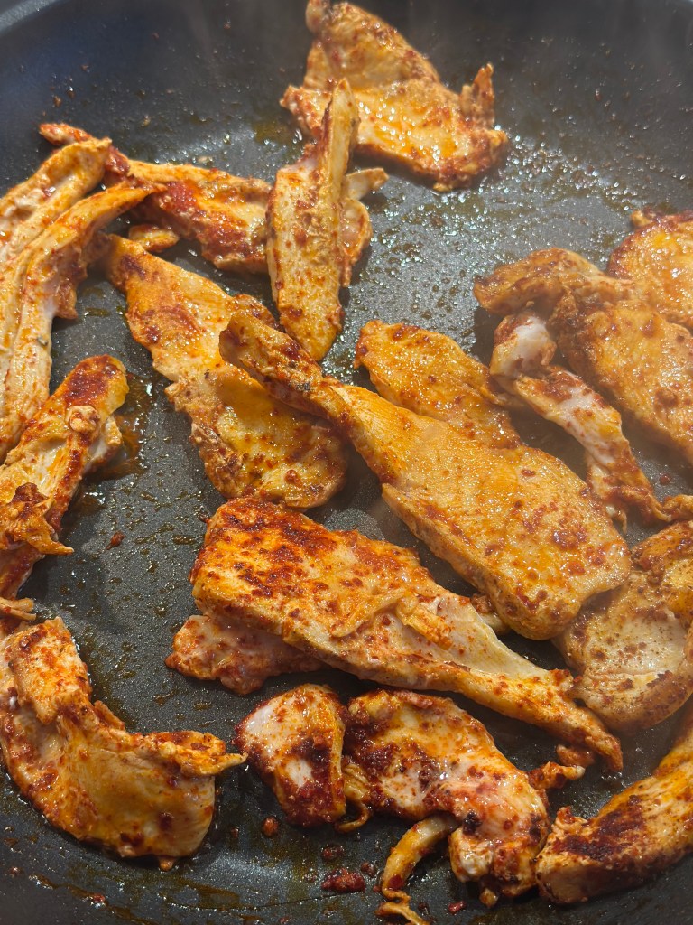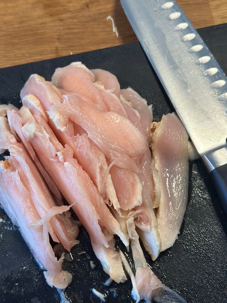 Den opskrift min søn sendte mig på Tiktok, have fisk i – og da det ikke lige er hans “kop te”, så lavede jeg en version med tyndtskåret kylling – det fungere vildt godt.