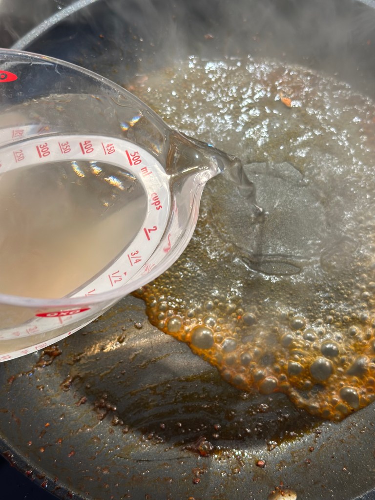 Kom 2 dl færdig dashifond på panden fra kyllingen. Kom tteok i, og tilsæt lidt efter lidt resten af ingredienserne. Forårsløg og spidskål til sidst.