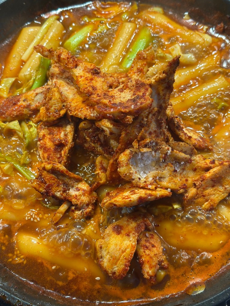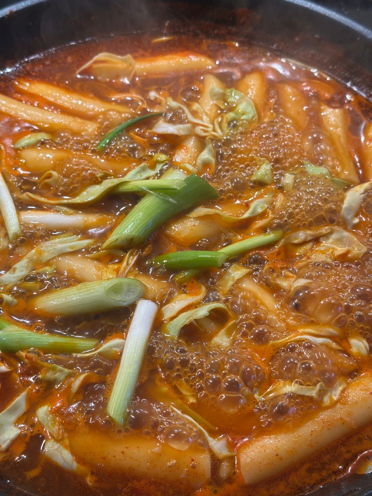 Tteokbokki (떡볶이) er en meget populær koreansk street food-ret lavet med seje riskager (tteok) i en stærk og let sød chilisauce. Riskagerne minder meget om pasta, men alligevel helt anderledes. De er mere cheewy og så er de lavet på ris – så de smager anderledes, og er en anden oplevelse at spise. Jeg skulle lige vende mig til dem.