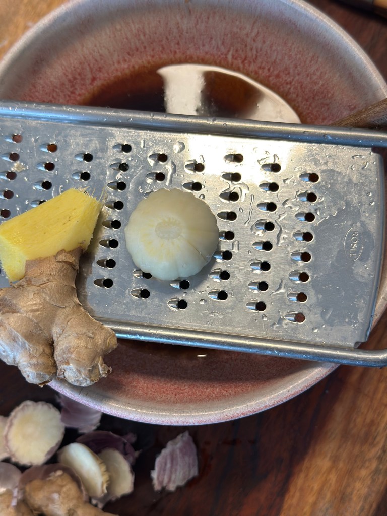 Lad marinaden med brun farin, doenjan, riseddike og mirin. Riv hvidløg og ingefær. Bland det hele godt.