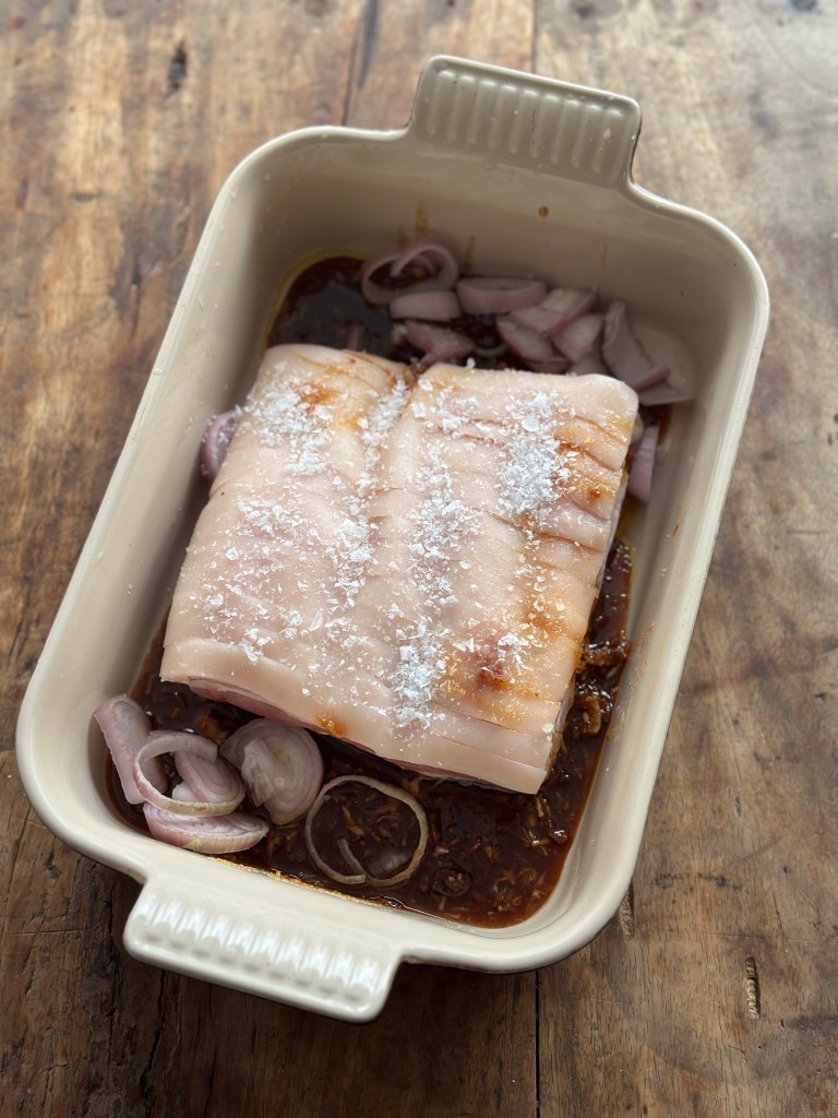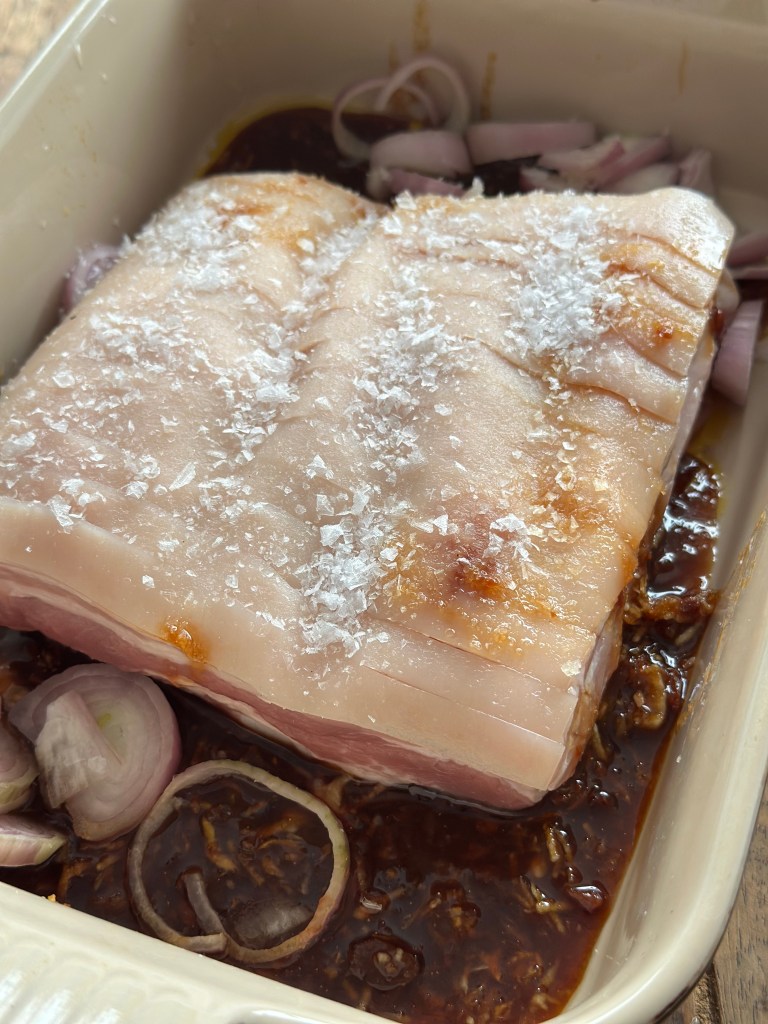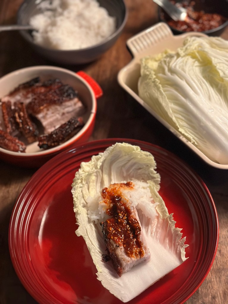 Og lad det være sagt med det samme – jeg kommer ikke til at spise kogt svineskind – det er simpelthen for klamt, og derfor har jeg lavet min egen fortolkning, hvor man både får smagen i kødet, men alt andet lige sprød svær. Er er så “bossam” ? Jeg har mange gange haft en diskussion om hvornår er noget er “noget”. Jeg kan godt lide den frie fortolkning af mad, og hvis man kigger på de retter som findes i verden, så er de alle mere eller mindre noget som er opstået i fusion med noget andet. Fx. bruge man meget glasnudler baseret på søde kartoflers stivelse, i det koreanske køkken. Men den søde kartoffel kommer fra sydamerika.
