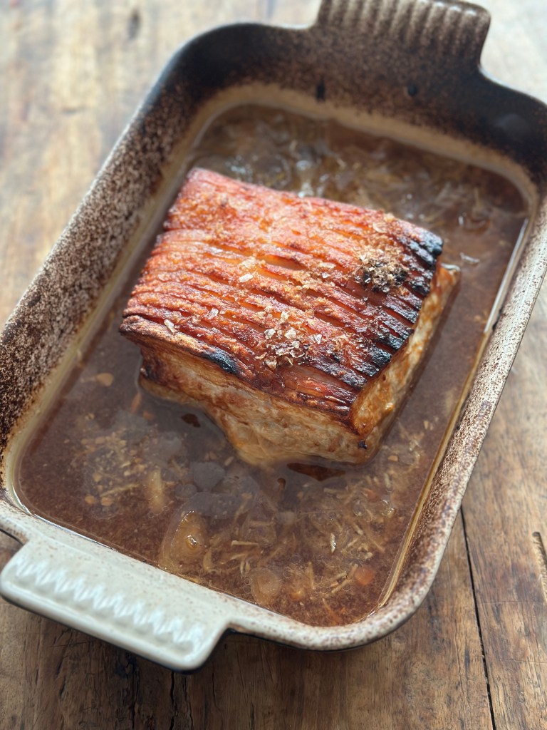 Smør bradepanden og kom stegen i. Tilsæt marinaden rundt om og top op med vand til lidt under sværen. Kom flagesalt på sværen og kom i ovnen ved 200 grader i 30 minutter – skru ned til 150 grader i 30 minutter, og hvis sværen er sprød, så er den færdig, og ellers giver du stegen – under opsyn – 220 grader i små 5-8 minutter.
