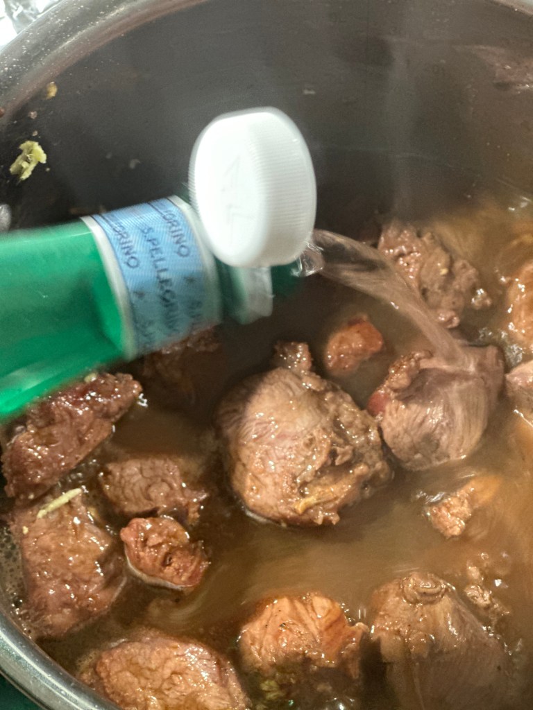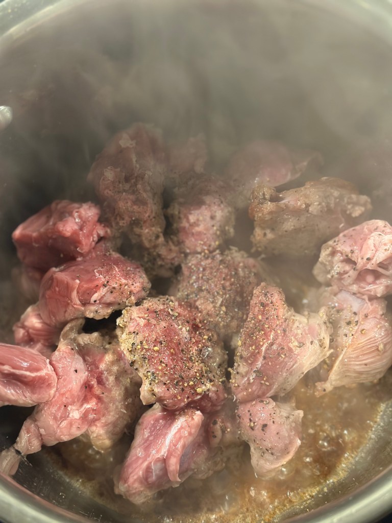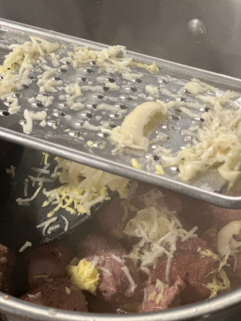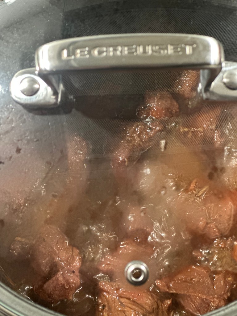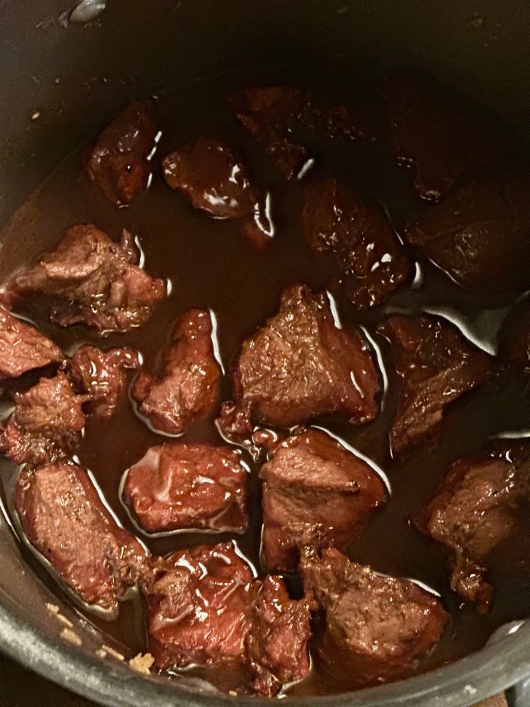 Kom sesamolien i en gryde – jeg bruger her en 3PLY fra Le Creuset. Kom grisekæberne i og brun dem. Tilsæt revet hvidløg og revet ingefær. Tilsæt danskvand, mirin, brun farin, rødvin, hoisin sauce, soyasauce og østerssauce. Sæt låg på og lad det simre i 90 minutter. Herefter tager man låget af, tilsætter nødder og peberfrugter, og koger saucen ind i ca. 15 minutter. Klar til servering.