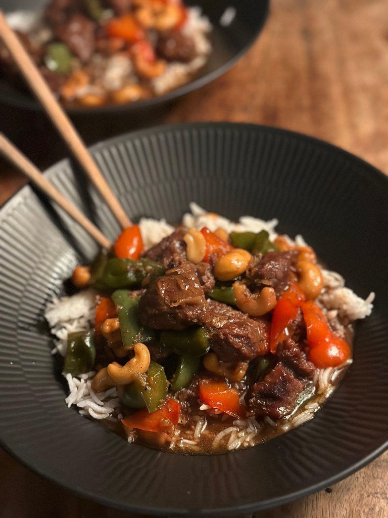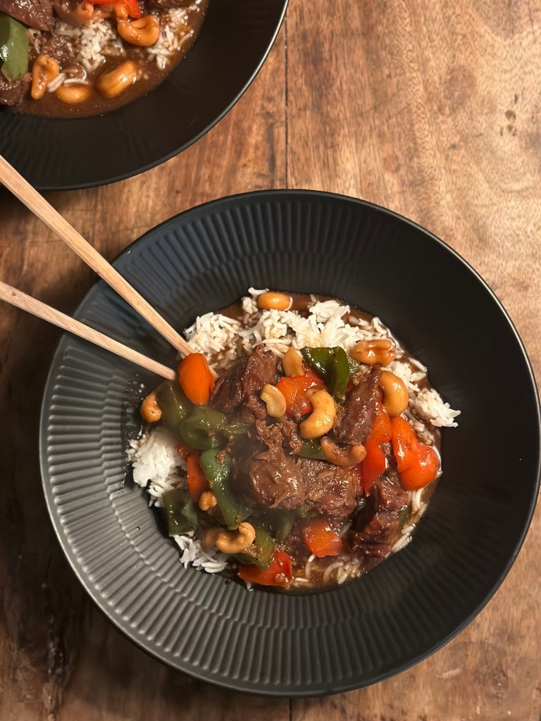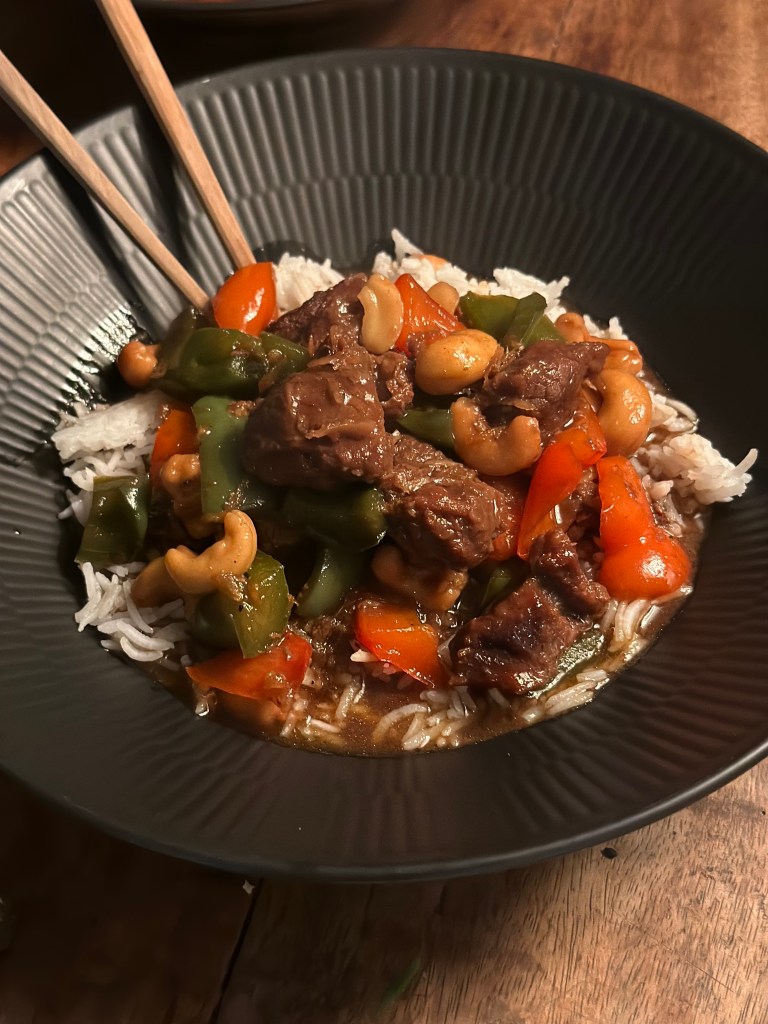 Når jeg tilføjer peberfrugter og cashewnødder til en hong shao, laver jeg en moderne, global fusion-version, hvor de klassiske braiseringssmage (soja + sukker + vin) møder wok-stejningens friske teksturer og nøddernes crunch fra moderne, internationale køkkentraditioner. Så dette er min fortolkning.