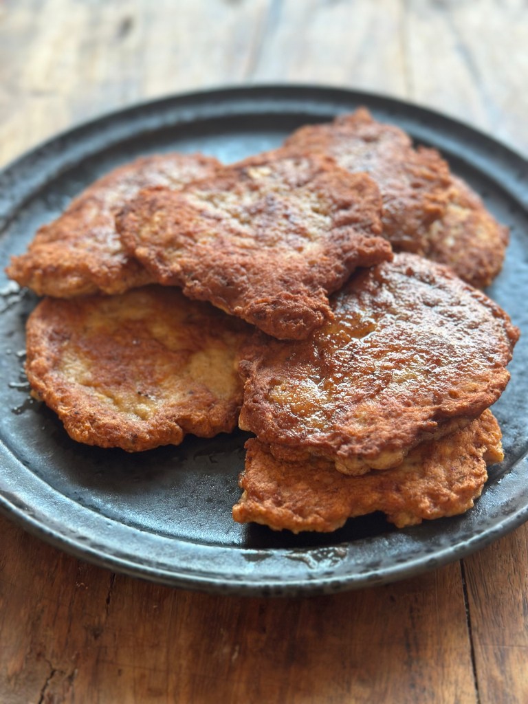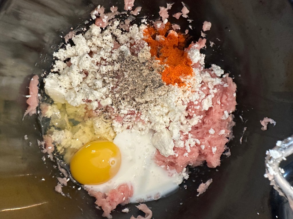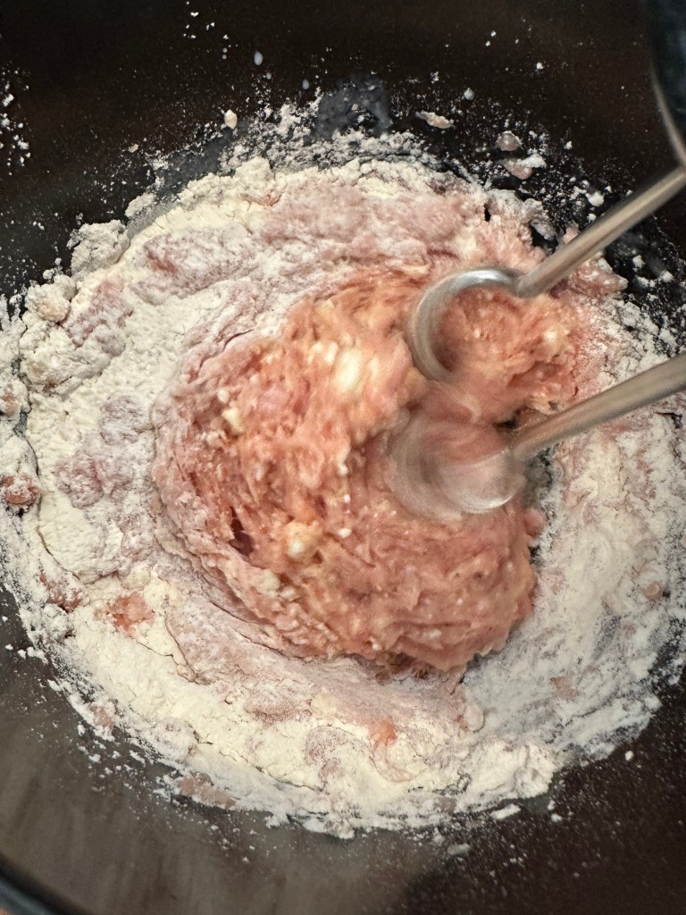 Rør først kød og salt sejt. Kom resten af ingredienserne. Rør godt sammen. Lad fasen hvile i 30 minutter. Jeg former som kugler, og når de kommer på panden, maser jeg dem flade med en stor palet. Steg i smør indtil de er gennestegte – lyder hult når du “banker” på den.