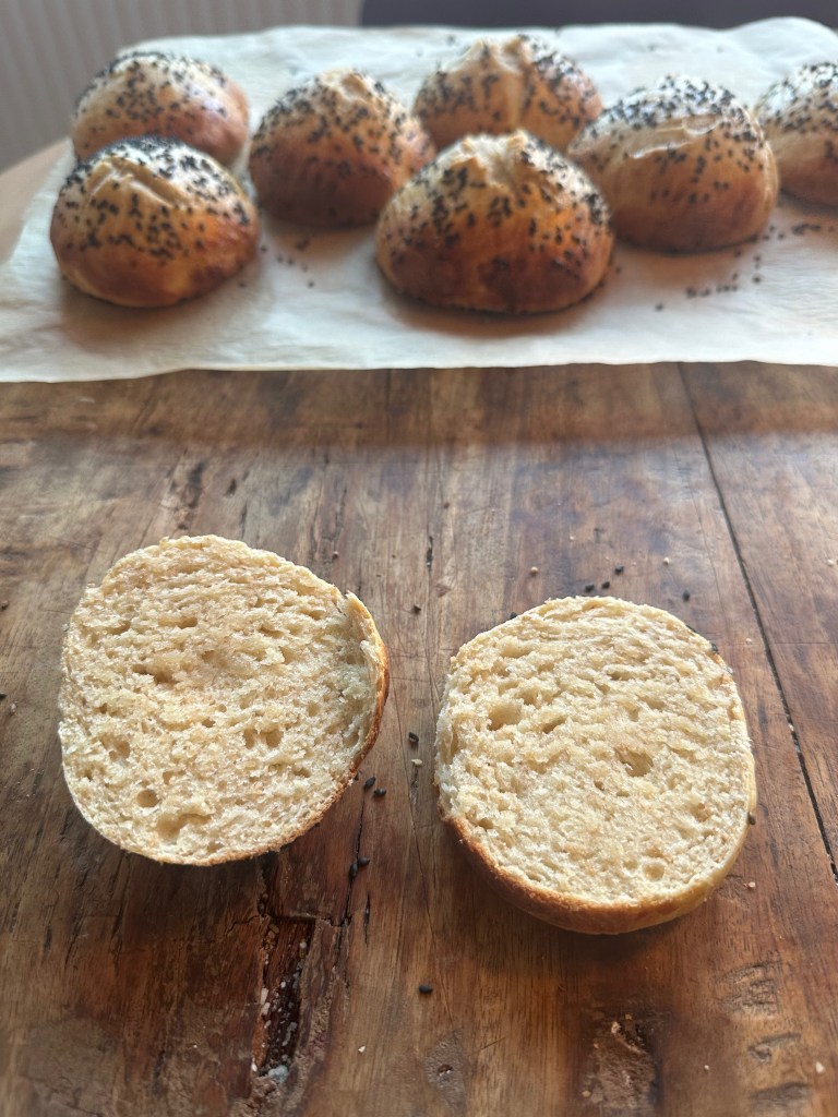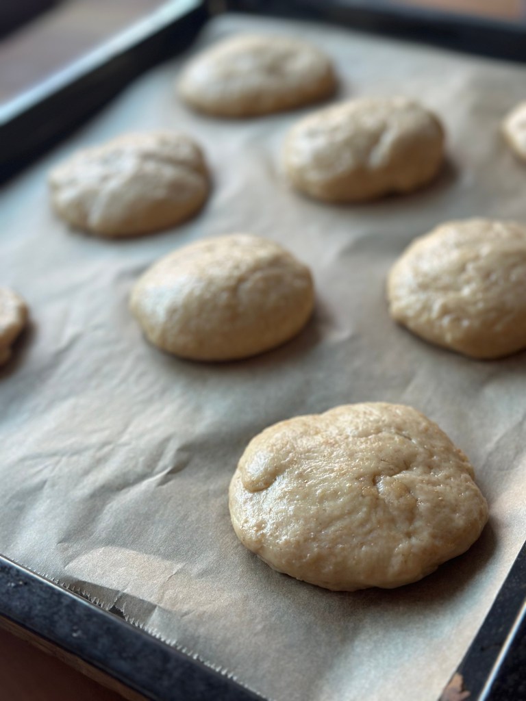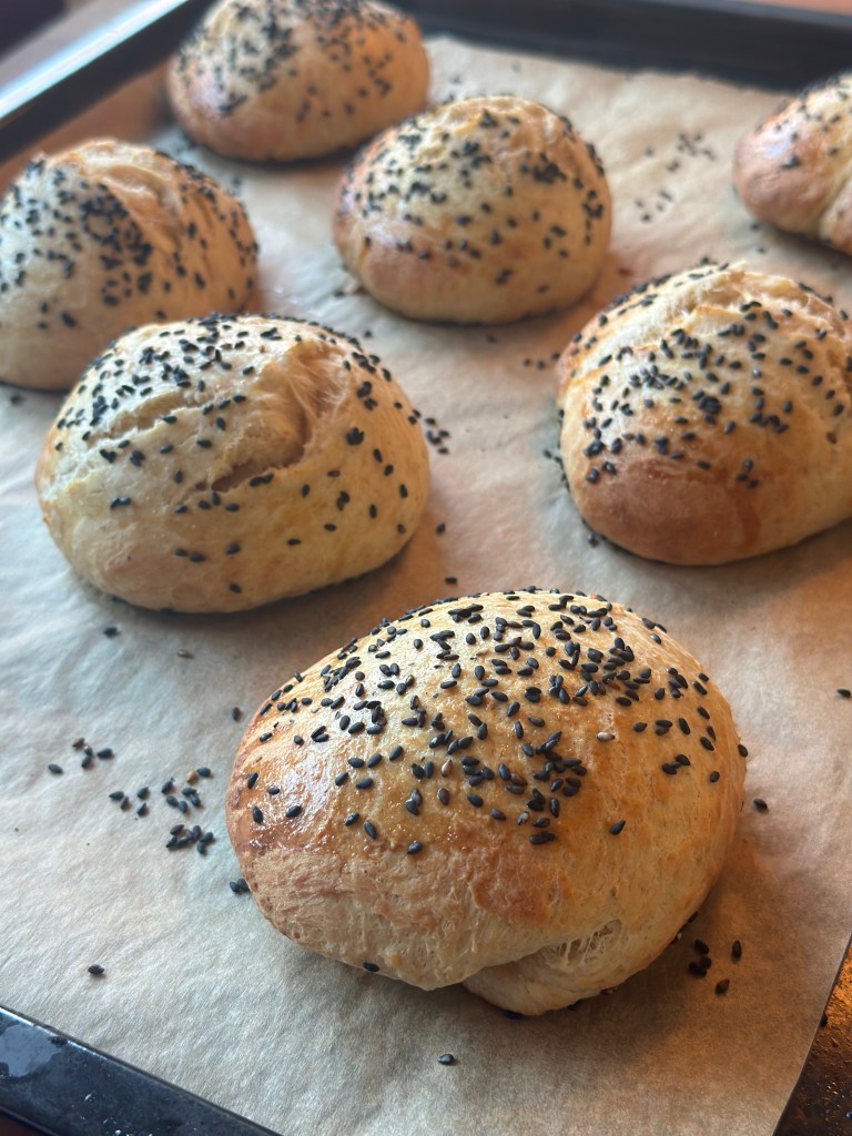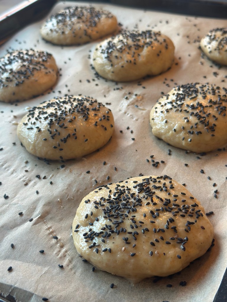 - Lad dejen hæve i en time, og opdel den herefter i 12 boller (jeg vejer dem til 90 gram), som formes helt rund (brug “virk-metoden”)og mases halvt flade. Lad dem efterhæve i 45 minutter og pensel med et pisket æg. Drys med sesam kerner – lav nogle med lys sesam og nogen med mørk.