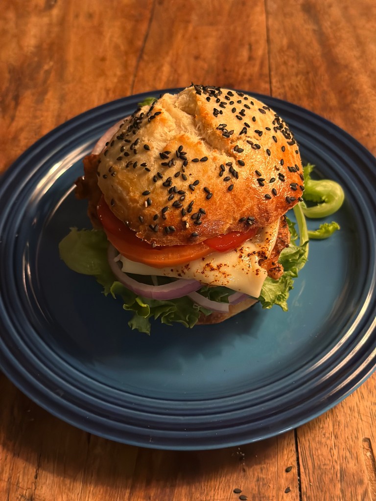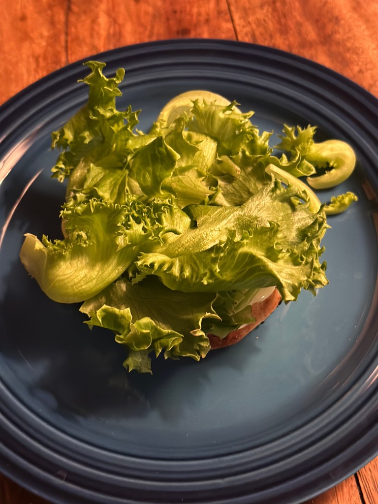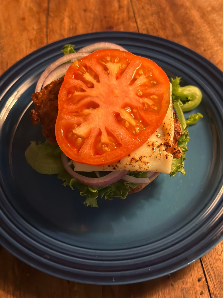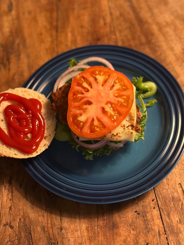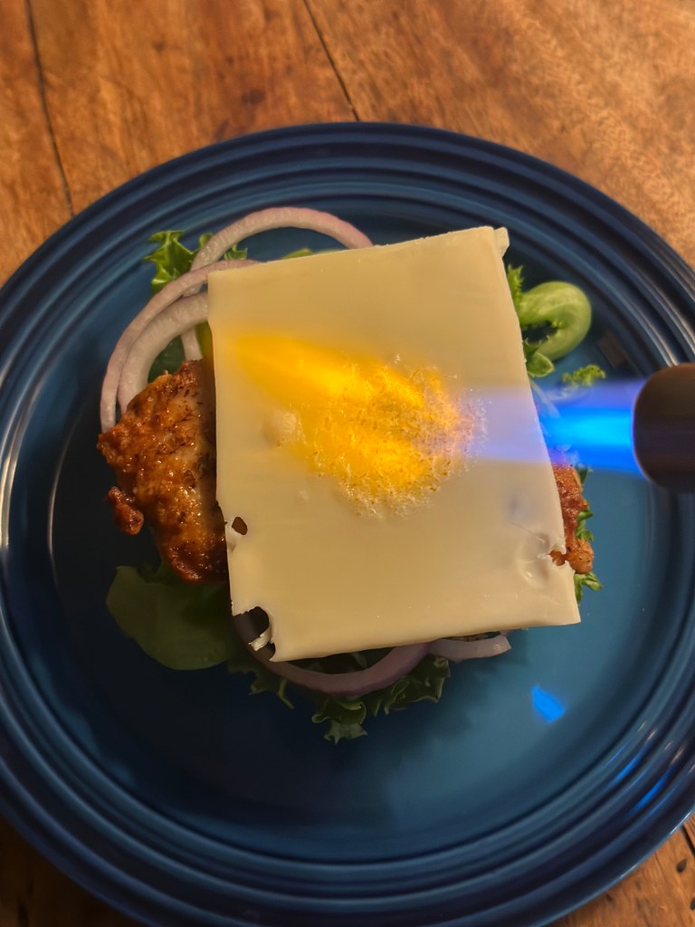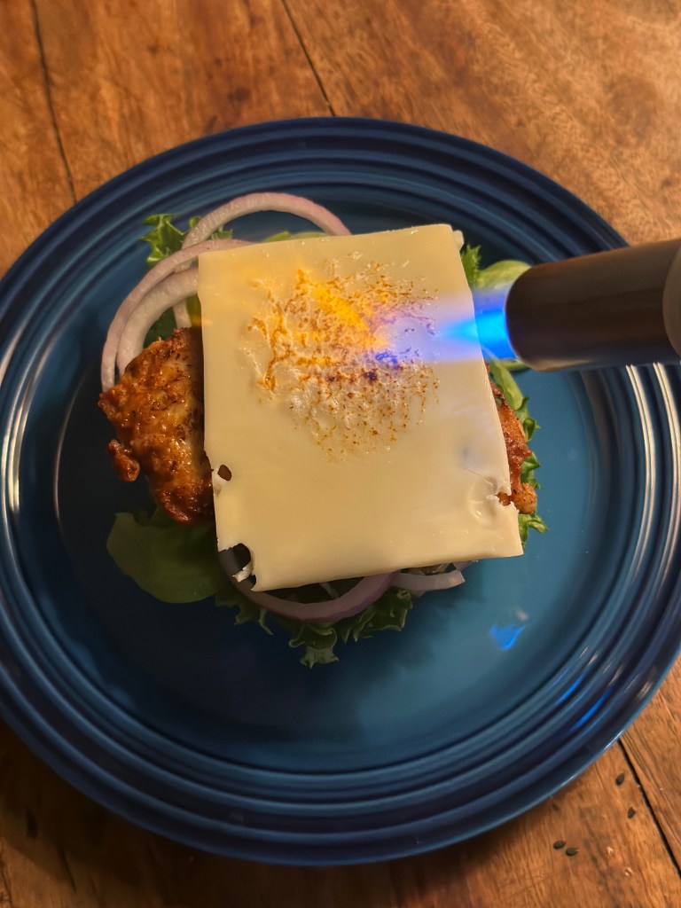 Jeg kommer lidt japansk mayonnaise på underbollen. Herefter crisp salat og ringe af rødløg. Så kommer jeg bøffen på og lægger et stykke stærk ost på, som jeg smelter med en varmeblæser. Så kommer der en skive bøf tomat på, og ketchup på overbollen.