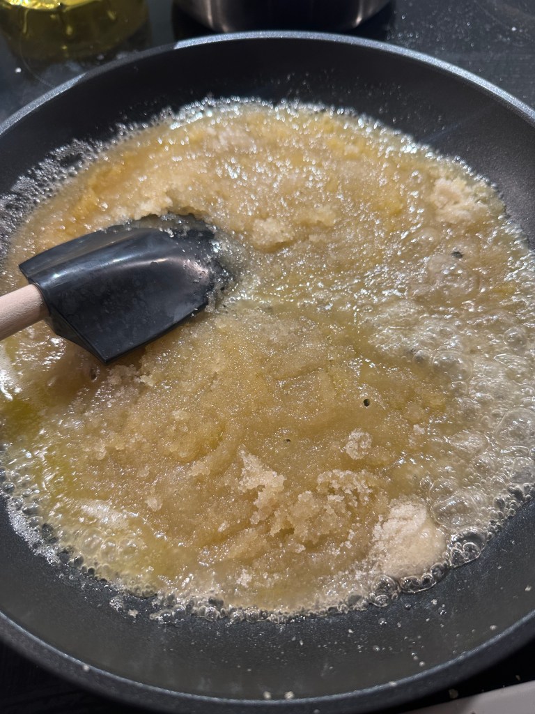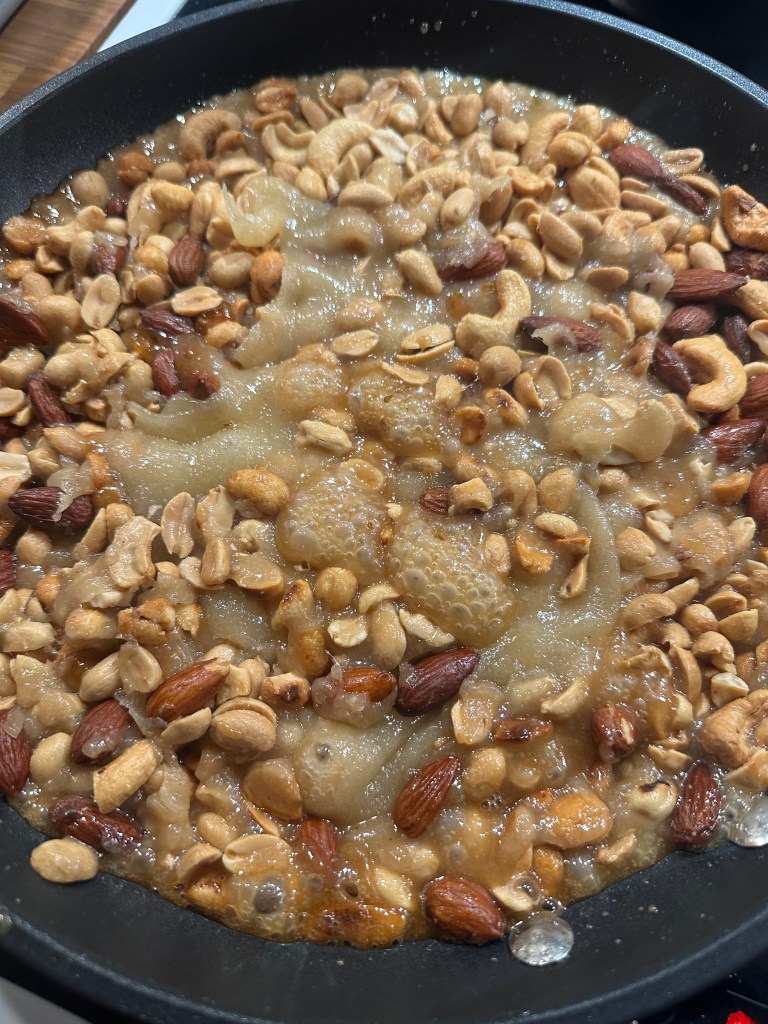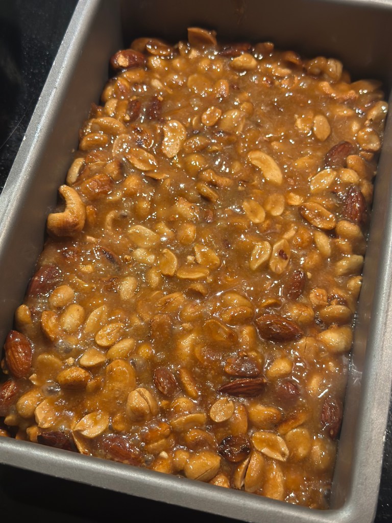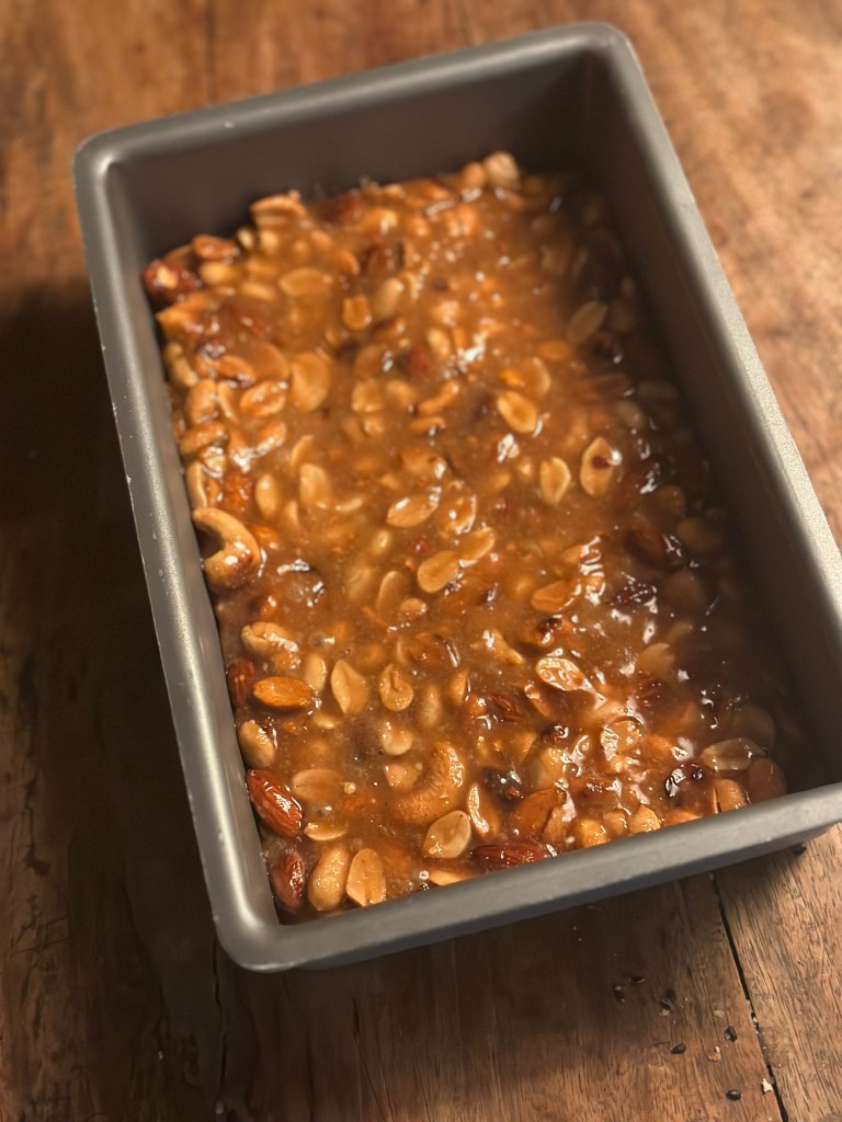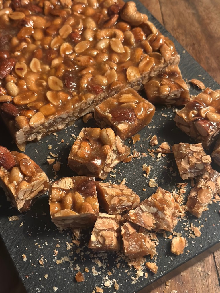 Når det er helt koldt, brækker du det i mindre stykker – præcis som Nøddebrud.