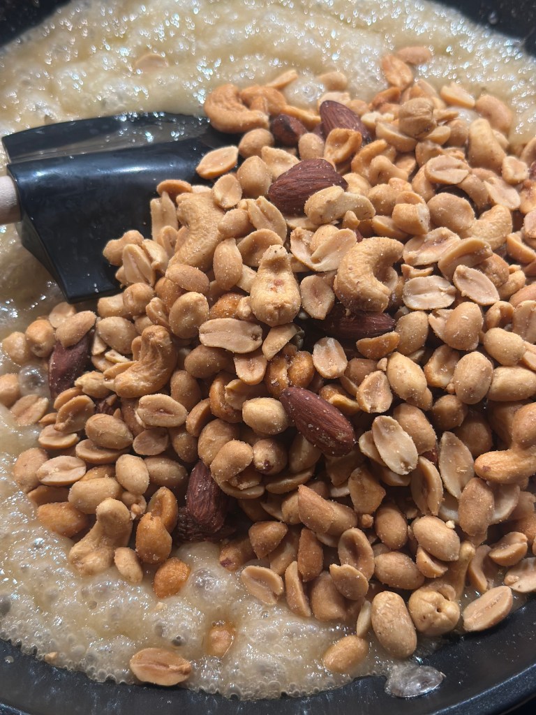 Læg bagepapir på en bageplade klar. Kom sukker, glykose sirup og smør på en pande ved middel varme. Rør forsigtigt, til det smelter og bliver gyldent. Kom nødder og salt i. Rør godt rundt, så alle nødder bliver dækket af karamellen. Lad massen boble let i 1–2 minutter, mens du rører – pas på det ikke brænder. Hæld straks blandingen ud i en form og fordel den i et tyndt lag.