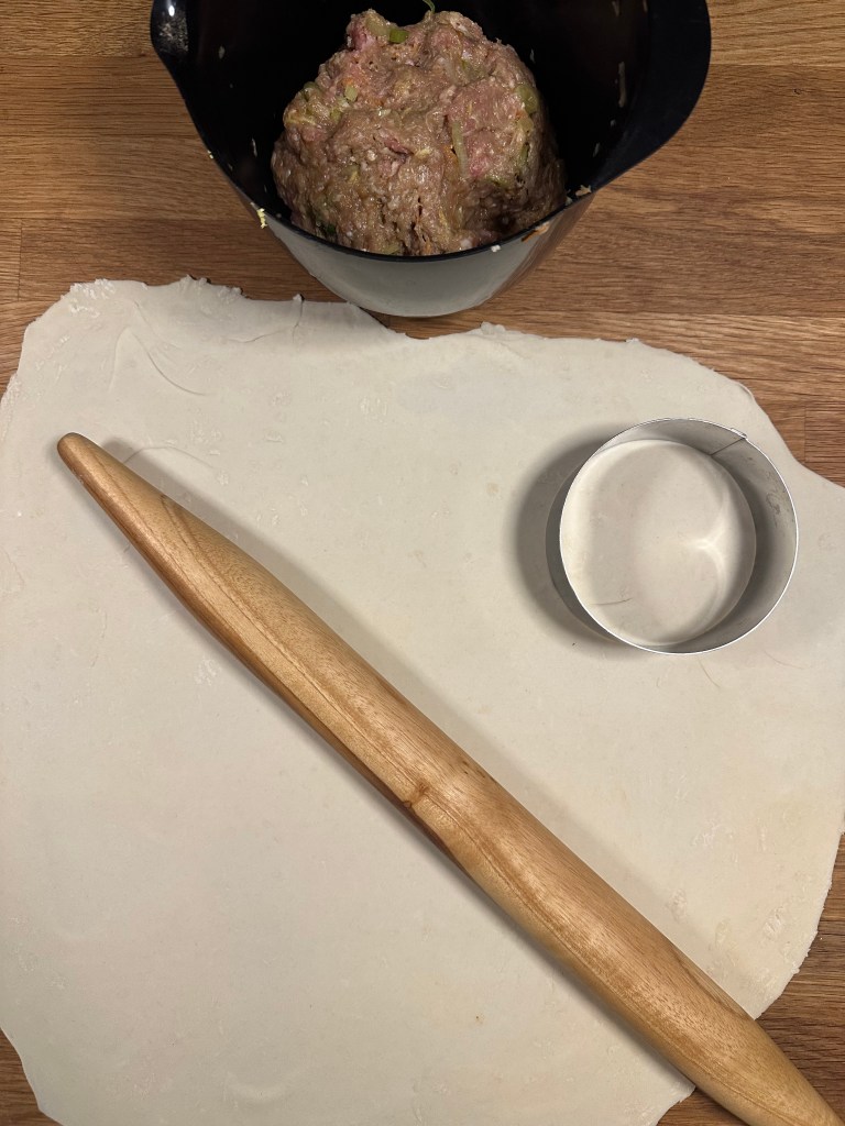 Jeg ruller dejen ud i ca. 1,5 mm tykkelse. Det giver ca. 16-18 dumplings. Man ville nok i Kina, gå ned til 1 mm, men det er virkelig svært at arbejde med.
