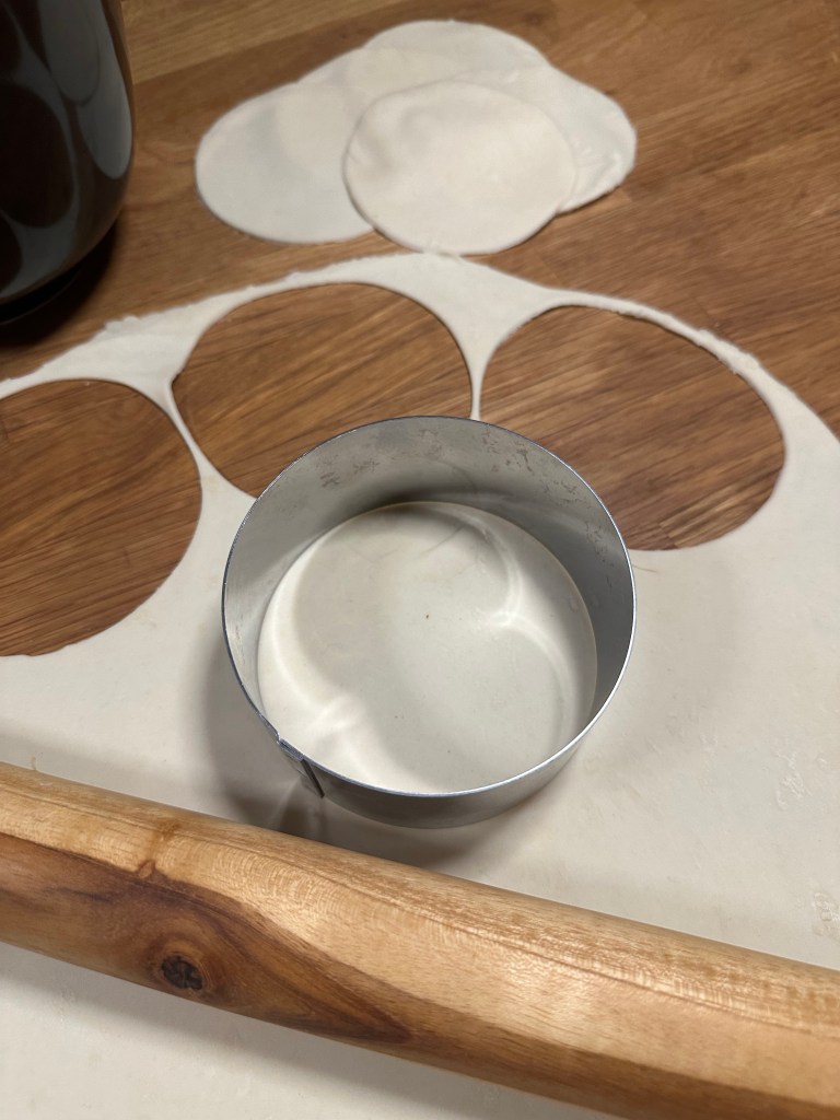 Når dejen er rullet ud, udstikker jeg den i 10 cm diameter. Den resterende dej samler jeg, og ruller ud igen – udstikker, indtil der ikke er mere dej.