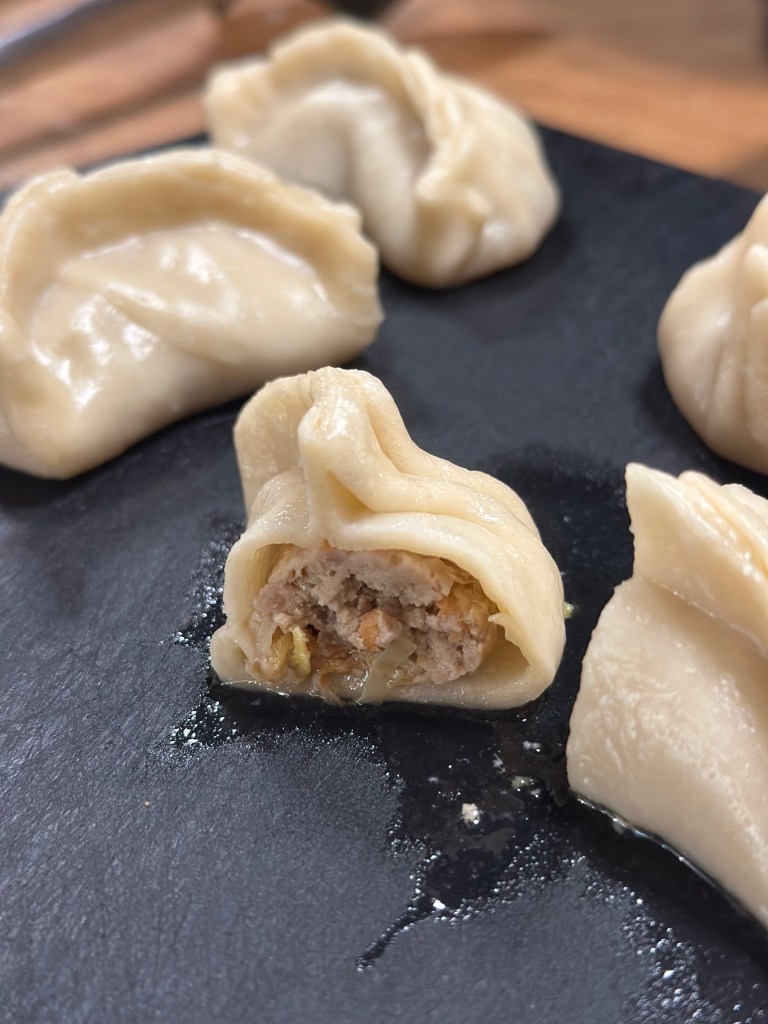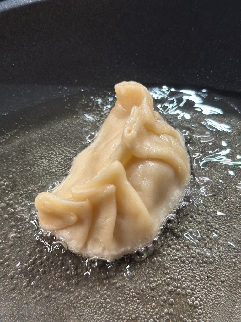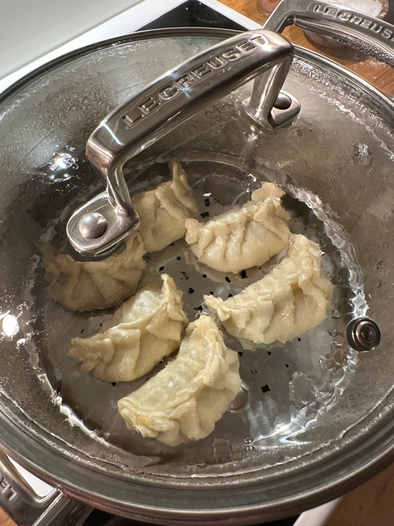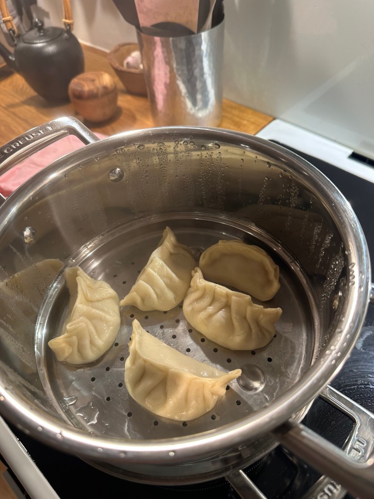 Der kan være 5-6 dumpling per “batch”. De skal have 10 minutter, hvorefter de skal tørre på en rist – ikke papir, for så får du aldrig papiret af igen.