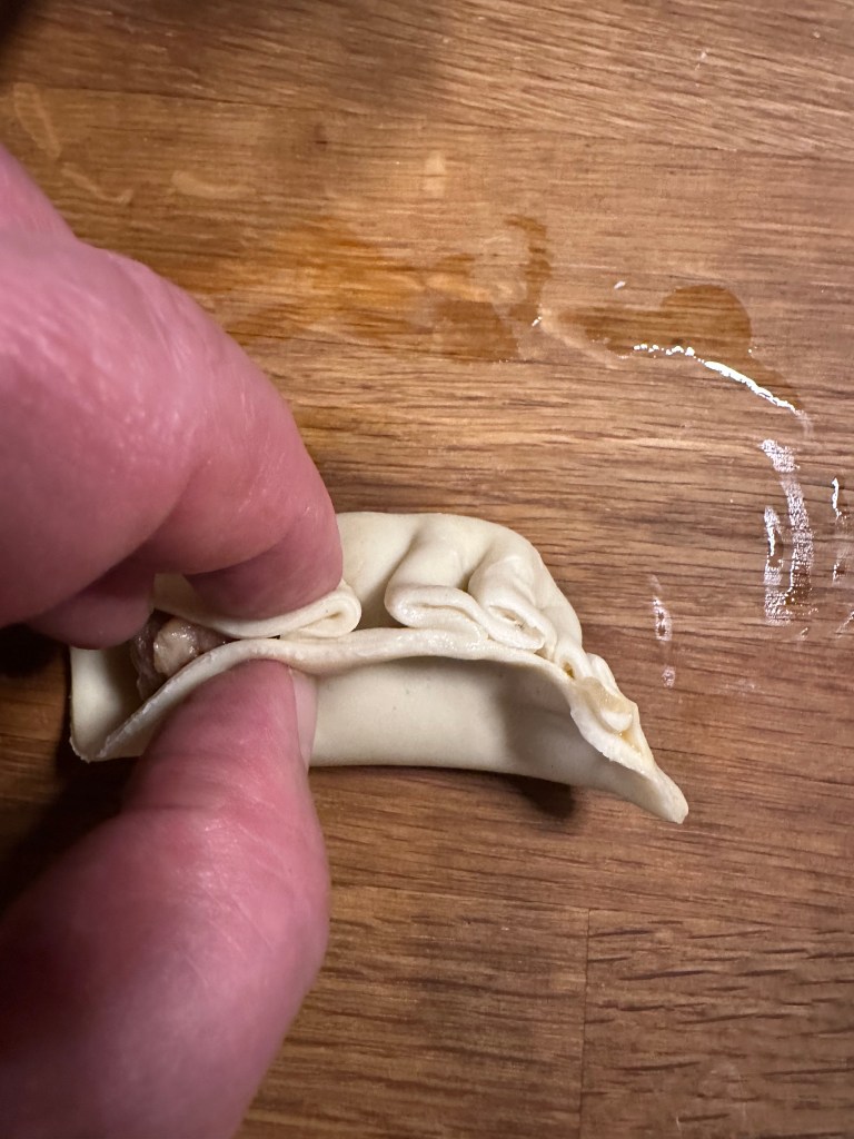 - Arbejd ud fra midten – den side som er længst væk fra dig (den fugtede), er den du folder. Man folder ud fra midten og hver side får ca. 4 folder. Systemet er, at du trækker lidt i dejen, folder ind mod midten og presser.