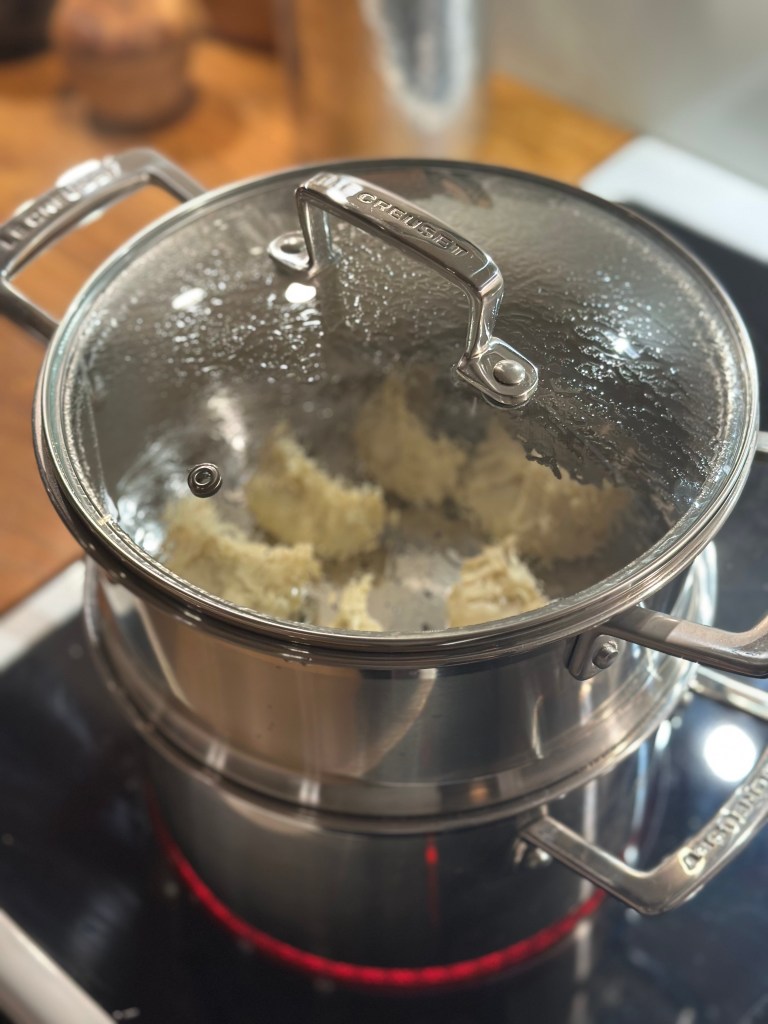 Jeg fylder gryden med 50% vand og sætter i kog. Skruer lidt ned, og sætte dampe indsatsen på.