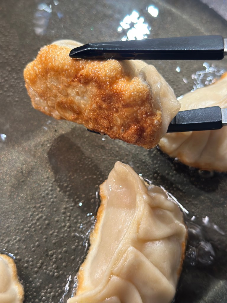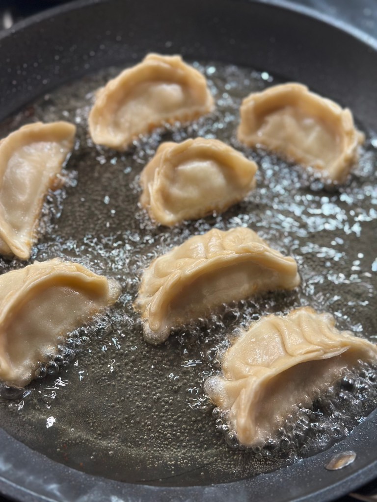 JAPAN STYLE: Når de er tørre og blanke, så kommer jeg fritureolie (50% rapsolie / 50% solsikkeolie) og frituresteger bunden – det flytter dumplings fra at være nogenlunde sunde, til slet ikke at være det… Men nøj, det smager godt.