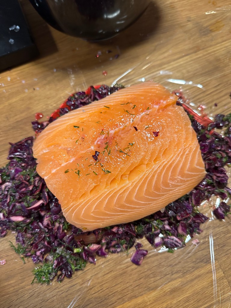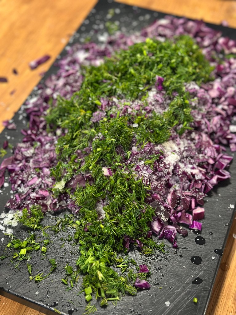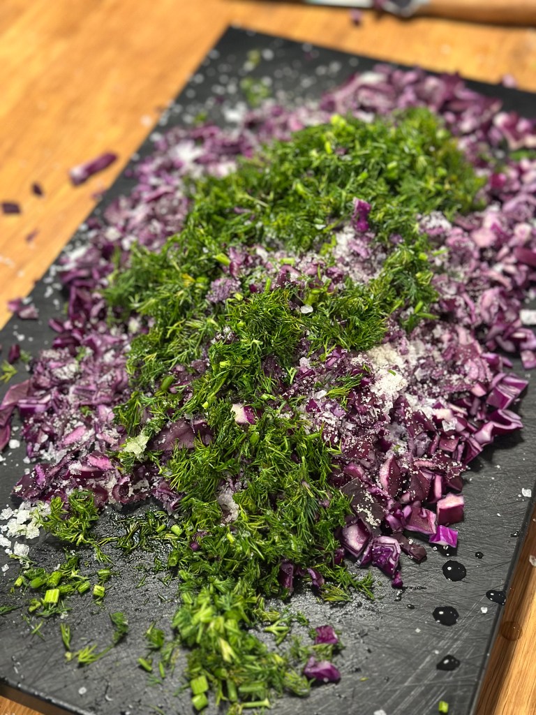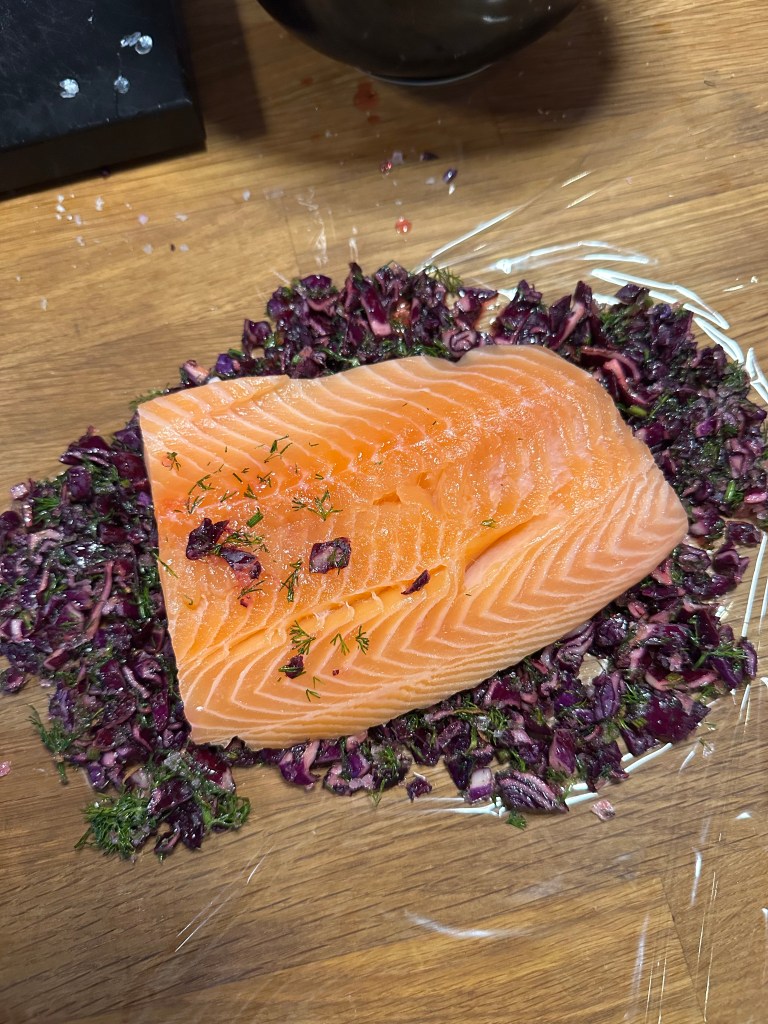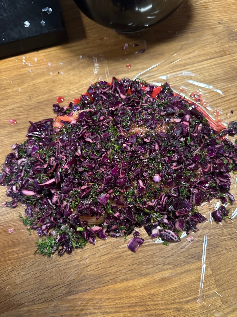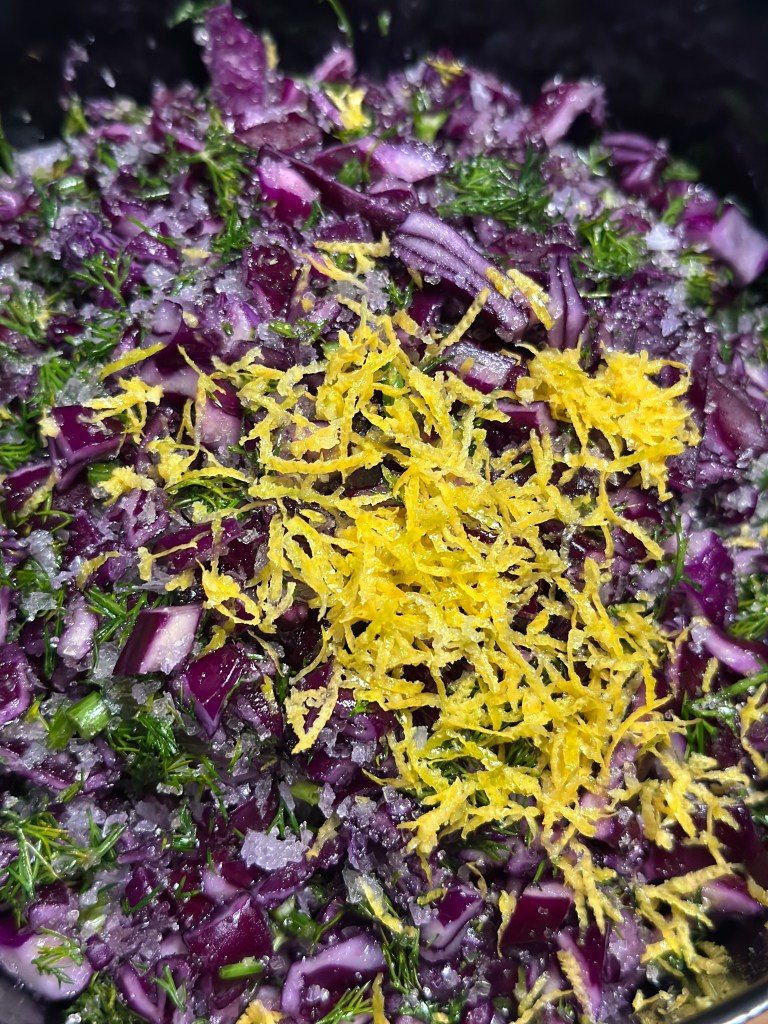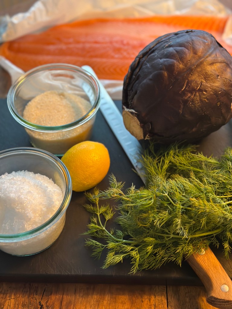 Så skal saltlagen laves, og jeg starter med at finthakke rødkål, og hakker ligeledes dild fint. Jeg river citronen, og presser bagefter saften – begge dele skal med. Blander det hele med salt og sukker, og fordeler det godt på begge sider af laksen og et tykt lag. Jeg stabler de to stykker.