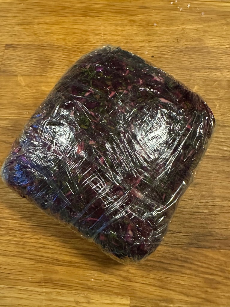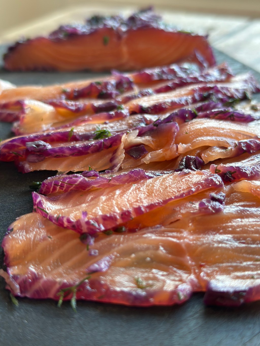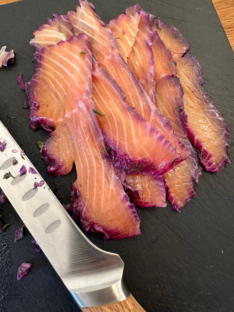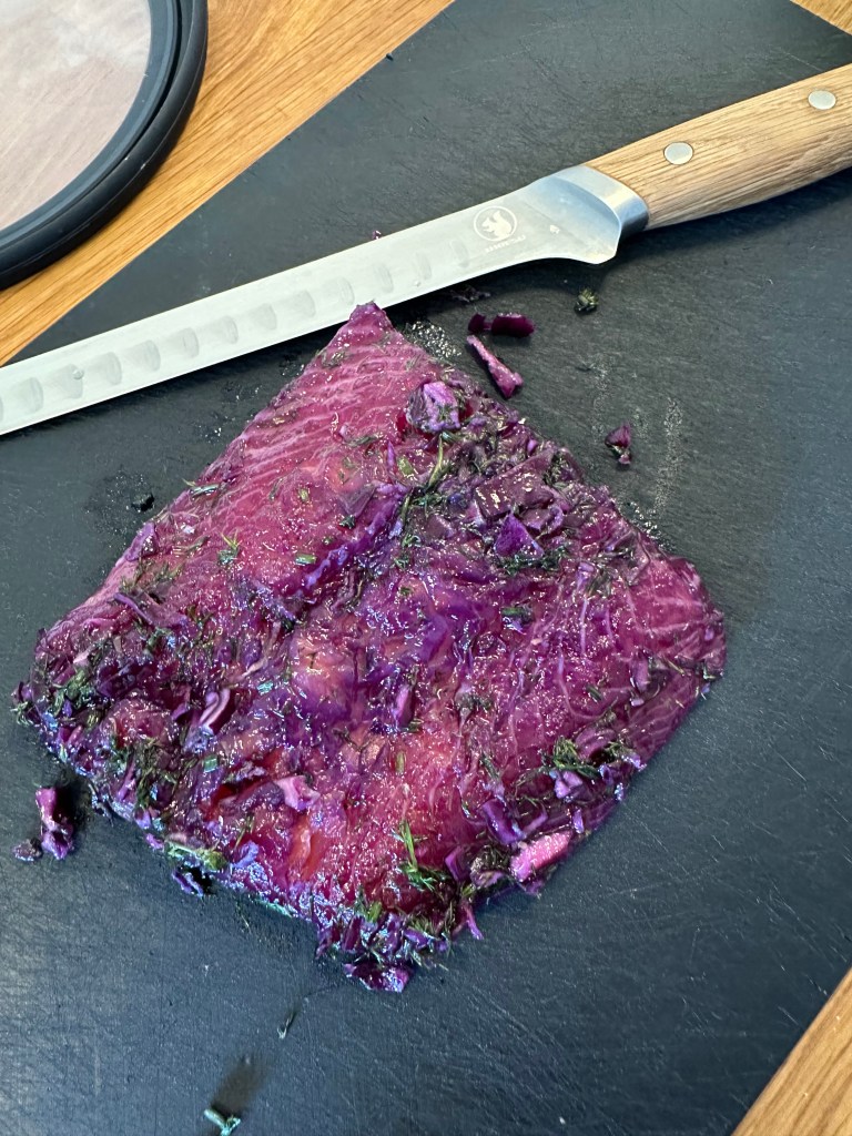 Jeg bruger rødkål som farvegiver. Andre bruger rødbede, men smagsbalancen imellem laks og rødbede eksisterer ikke – efter min smag.