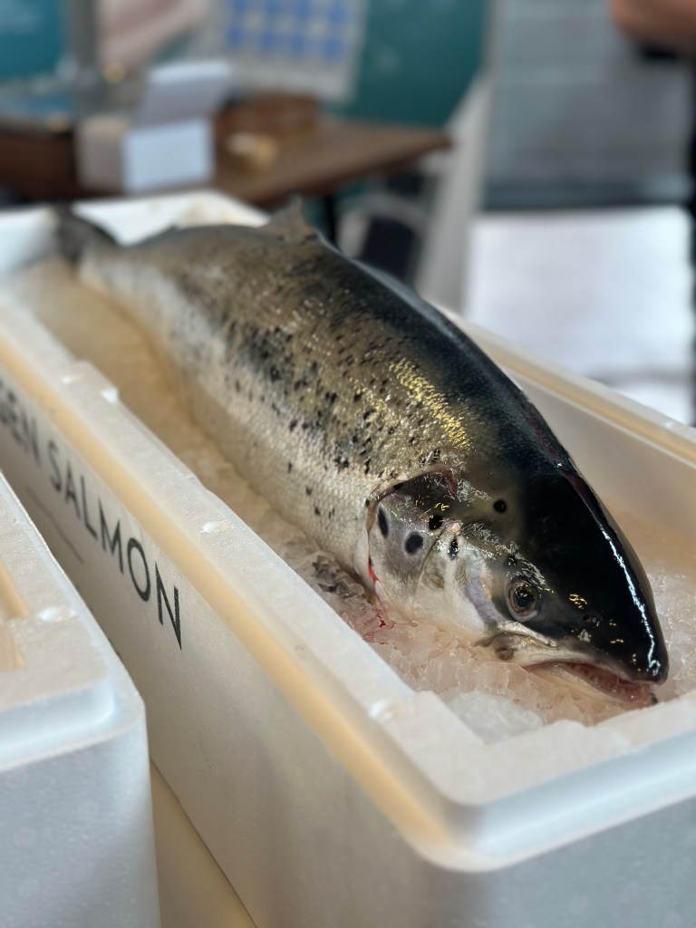 Føden som laksen får er produceret i Danmark, og er en kombination imellem fiskebestanddele og plantebaseret elementer som soya, hvede, majs med mere. Kosten er hovedsagelig plantebaseret – som jeg forstod det, omkring 80%. Foderet er tilpasset fiskens forskellige udviklingstrin. Fx. starter fisken med at leve i ferskvand ligesom de vilde laks, og siden i saltvand. Der er en utrolig debat om laks for tiden.