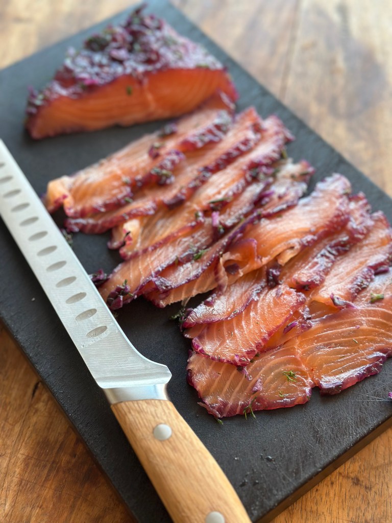 Jeg laver her gravad laks, og har lavet den lidt mere spændende – dels ved farven, men også ved smagen.